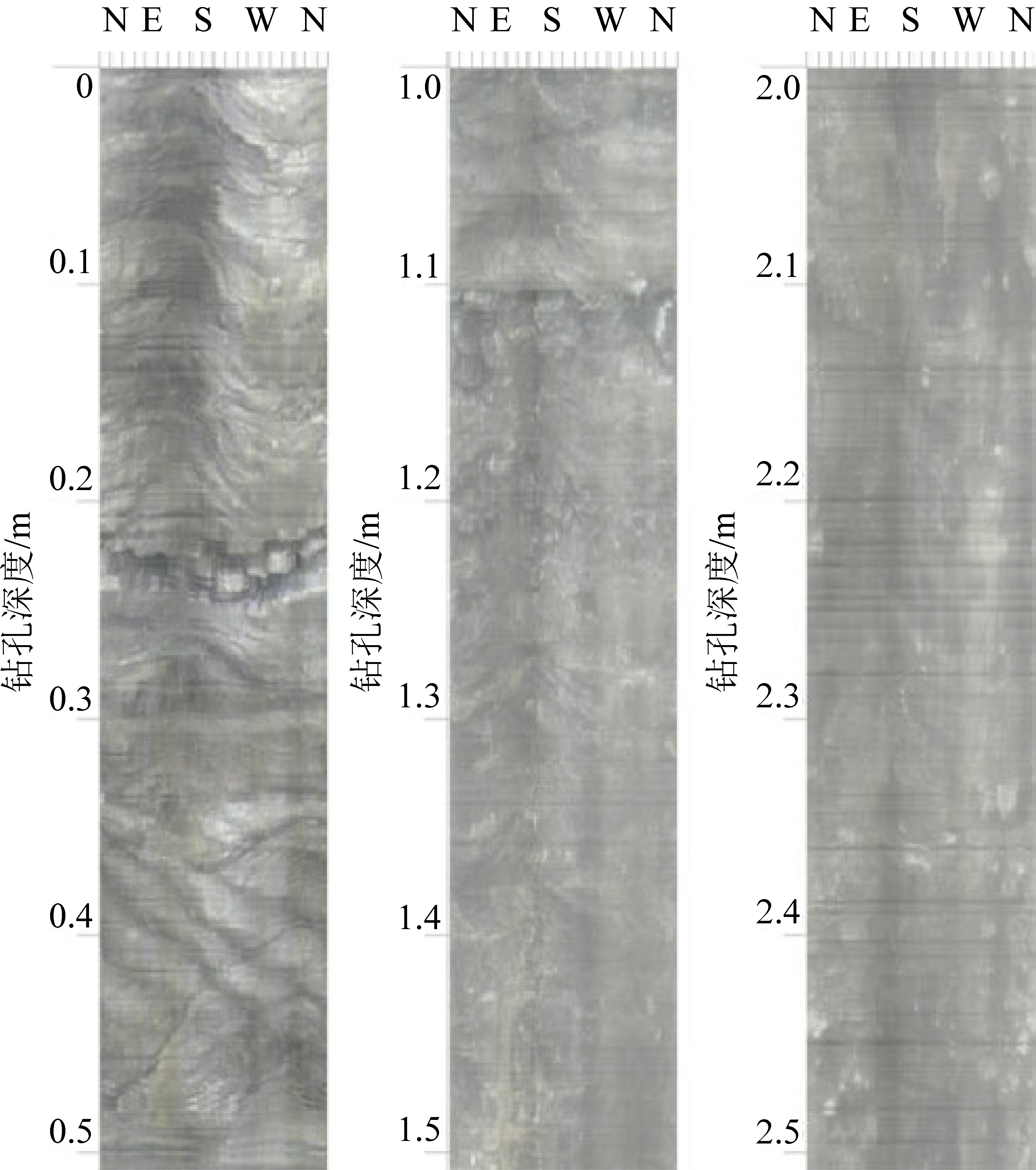 通过2613 回采工作面下平巷掘进工作面顶板锚索钻孔进行围岩结构窥视,孔壁平面展开如图2所示。 钻孔浅部0.2~0.5 m、1.1~1.3 m 范围内局部存在明显张开裂隙、破碎情况,顶板砂岩自然赋存结构完整性一般。