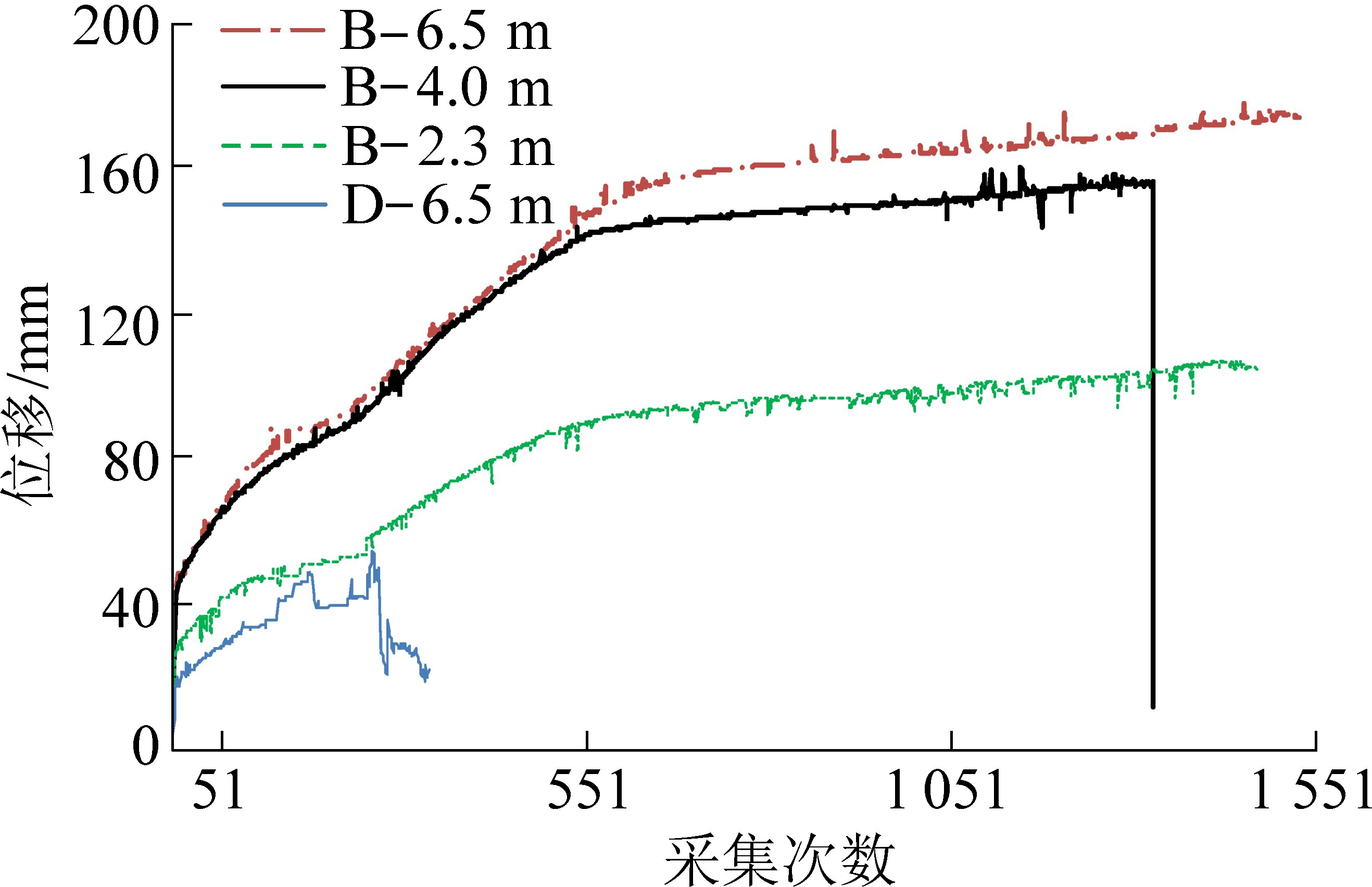 B-6.5 m、B-4.0 m、B-2.3 m—下帮钻孔6.5、4.0、2.3 m 处监测点;D-6.5 m—顶板钻孔6.5 m 处监测点