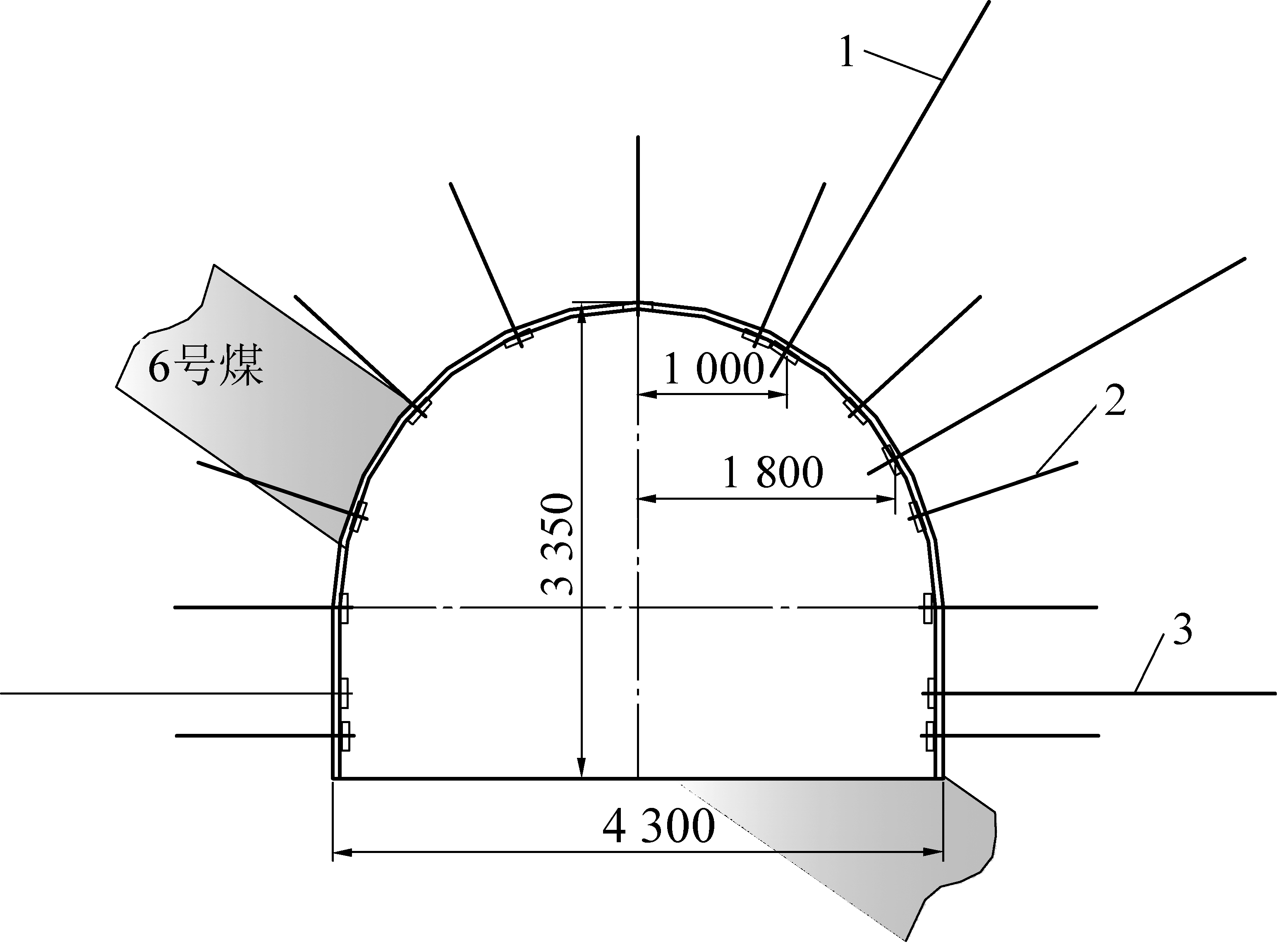 1—顶板注浆锚索;2—CRMG700 锚杆;3—帮注浆锚索