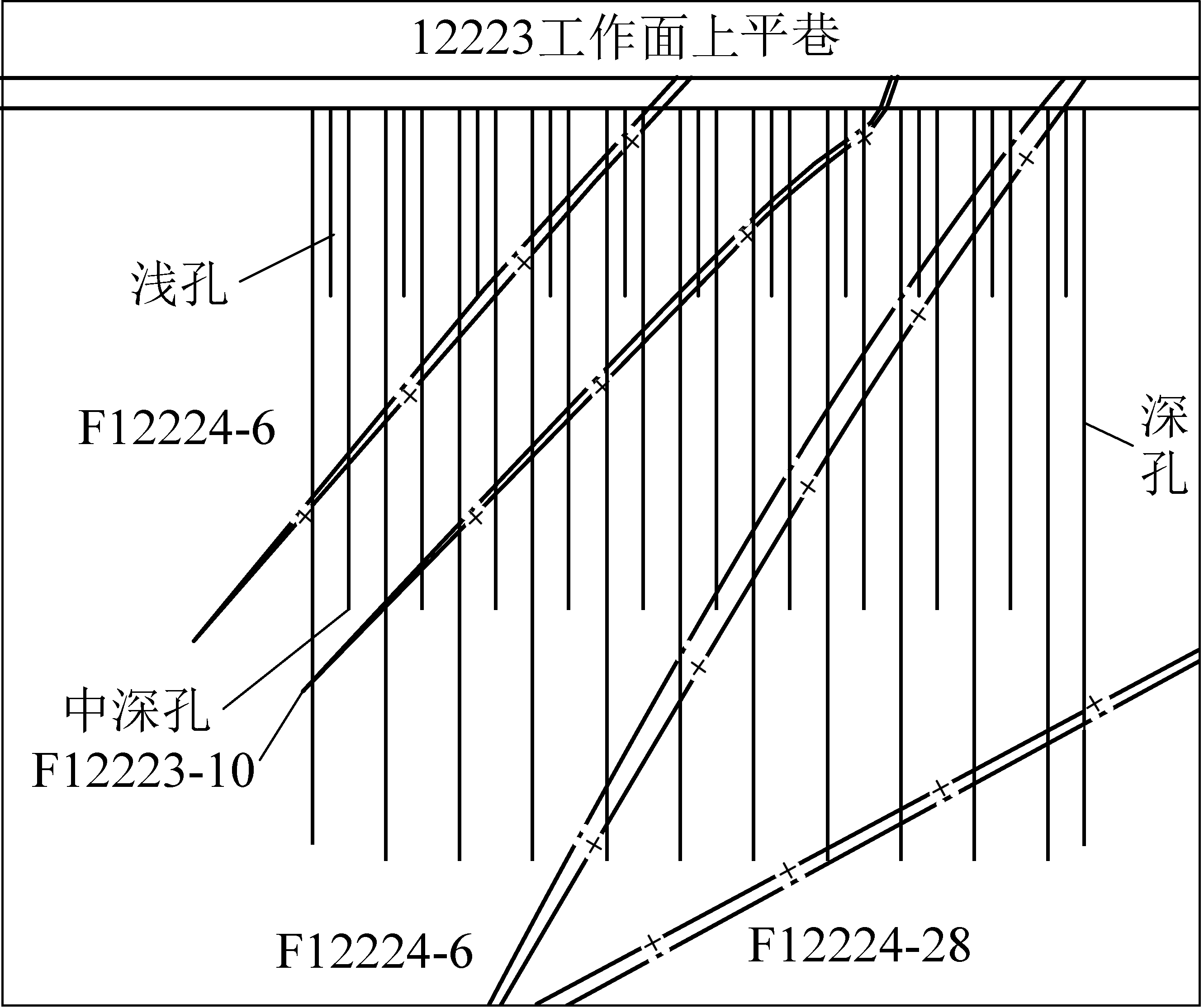 1)回采巷道内巷帮平行递进式钻孔。 适用条件:断层组或断层走向与工作面回采巷道走向夹角较小(小于45°)的单一断层构造带。 钻孔布置方式:在回采巷道内垂直巷帮施工平行钻孔,钻孔深度递进式分布,钻孔终点分布于工作面顶板。