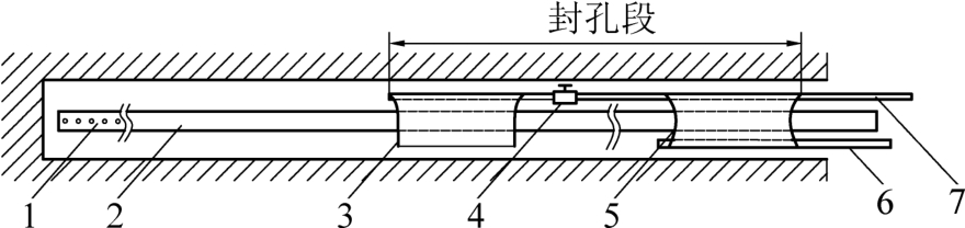 1—注浆花管;2—注浆实管;3—封孔囊袋;4—三通爆破阀;5—封孔囊袋;6—囊袋返浆管;7—囊袋注浆管