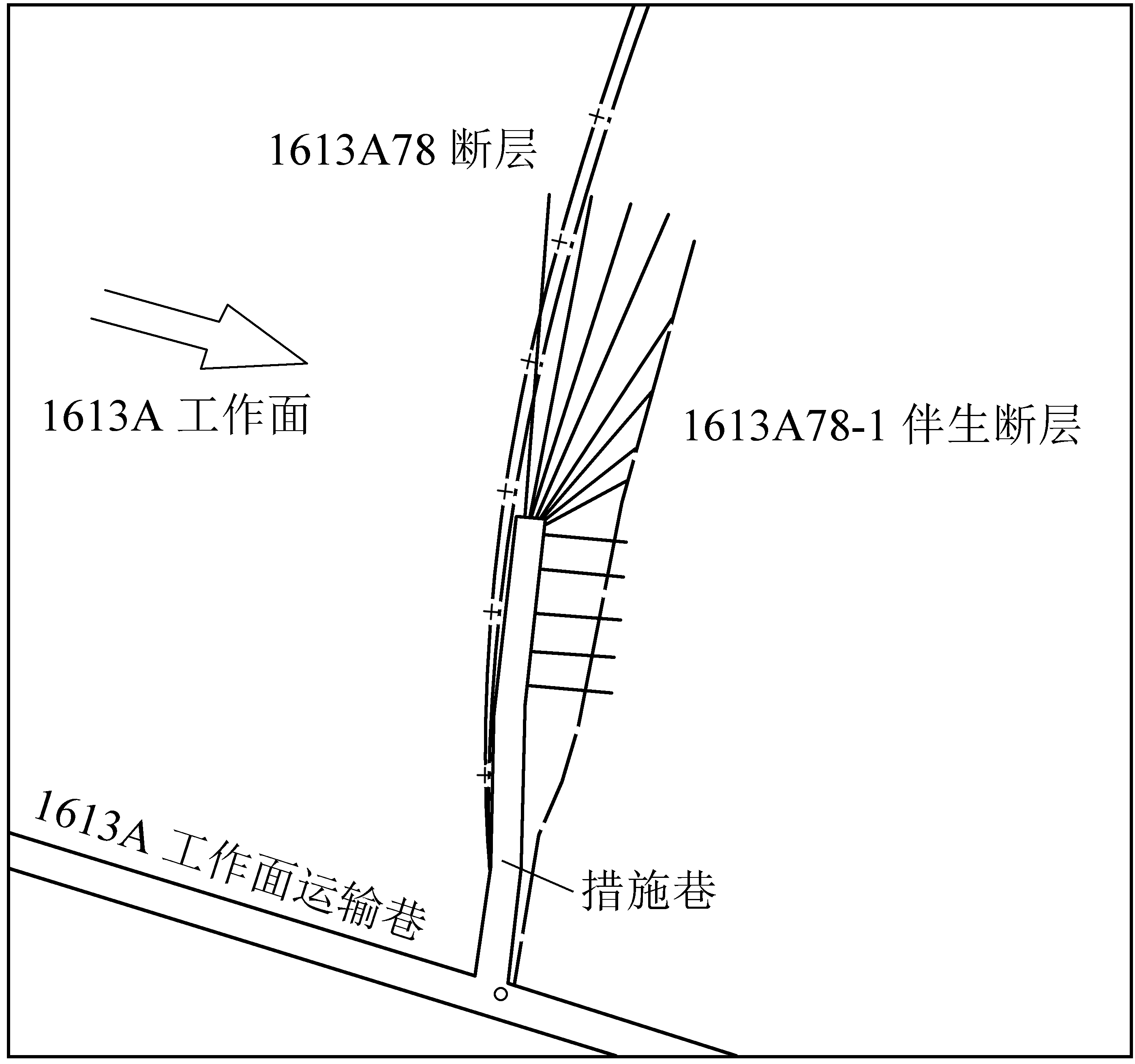 张集矿1613A 工作面距开切眼380 m 处在运输巷内揭露F1613A78 断层和F1613A78-1 伴生断层,F1613A78 断层落差5 m,倾角90°,与工作面夹角约13°;F1613A78-1 伴生断层落差4 m,两断层影响回采范围约40 m。