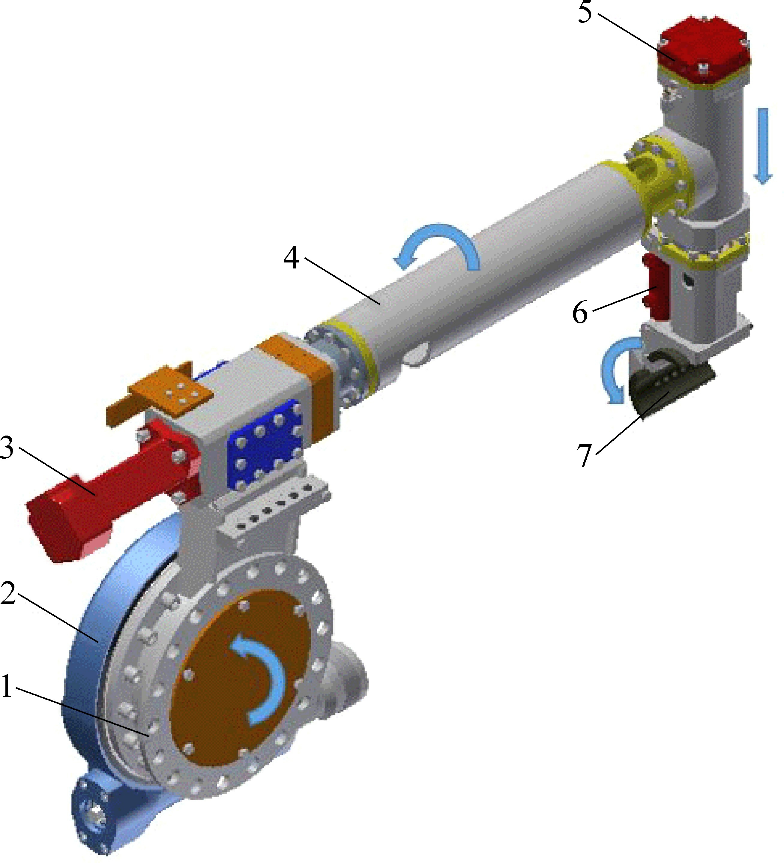 1—旋转臂;2—回转减速器;3—液压马达;4—回转臂;5—伸缩油缸;6—夹紧油缸;7—卡瓦