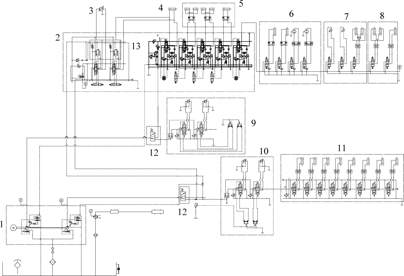 1—负载敏感串泵;2—负载敏感多路阀;3—动力头旋转;4—动力头推进;5—双夹持器;6—机械手;7—钻进状态;8—钻杆箱;9—副车行走;10—主车行走; 11—钻机锚固;12—二位三通换向阀;13—溢流阀组