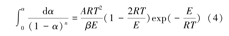 将程序升温速率β =dT/dt 代入式(1)中,并对温度积分做1 级近似,则有
