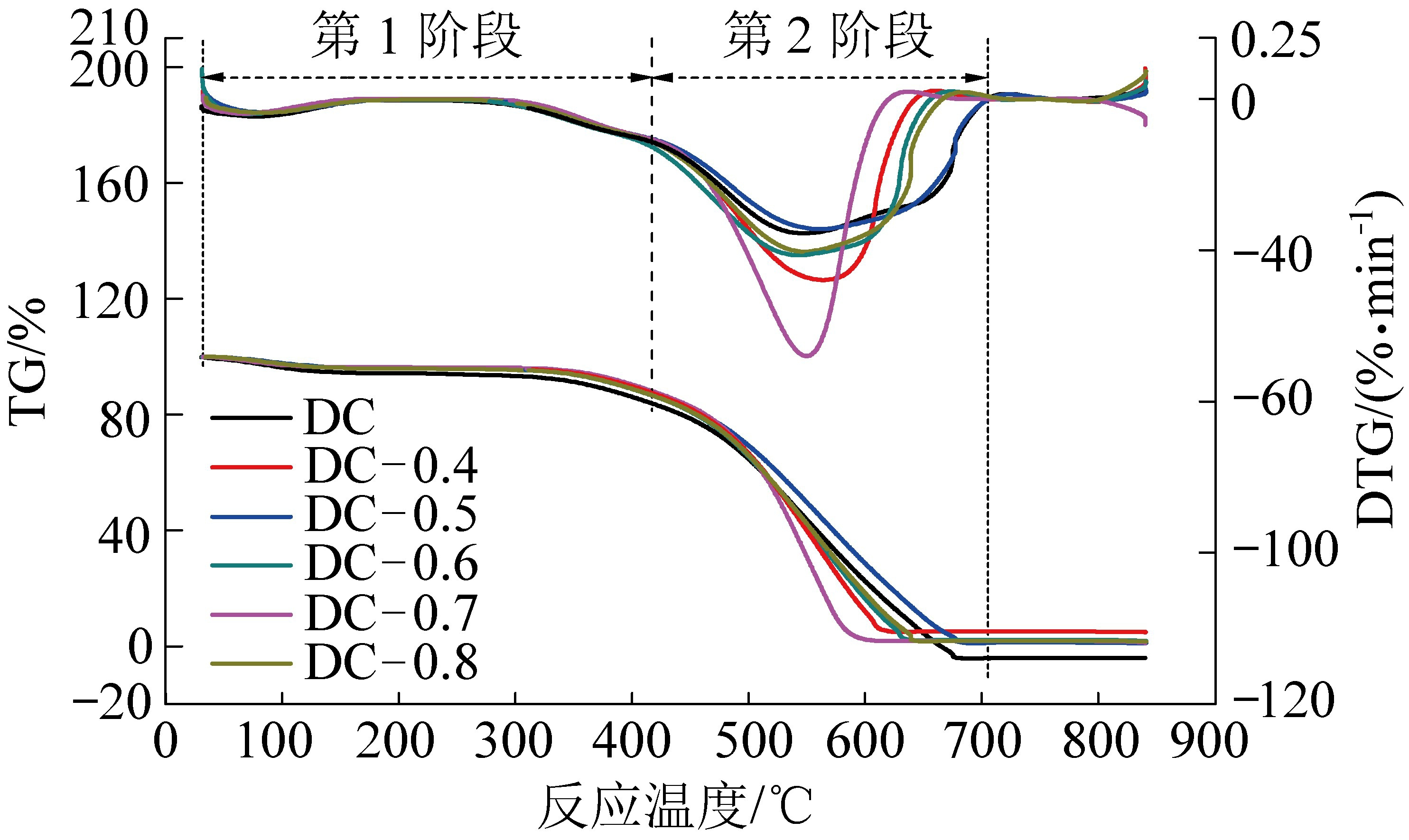 模型化合物燃烧的TG-DTG 曲线如图3 所示,MH 的燃烧过程与DC 类似,燃烧过程可分为2 个阶段(第1 阶段30~490 ℃,第2 阶段490~710 ℃)。