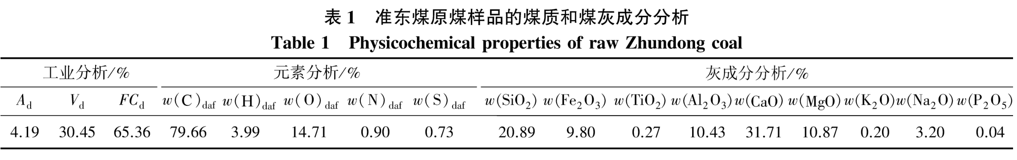 用破碎机将准东煤进行破碎处理,再用网径0.15 mm的标准筛进行筛取,然后进行酸洗、水洗脱灰并干燥。 将原煤用盐酸酸洗脱除原煤中的可溶性无机盐,以排除试验过程中其他可溶性无机盐对试验的干扰。