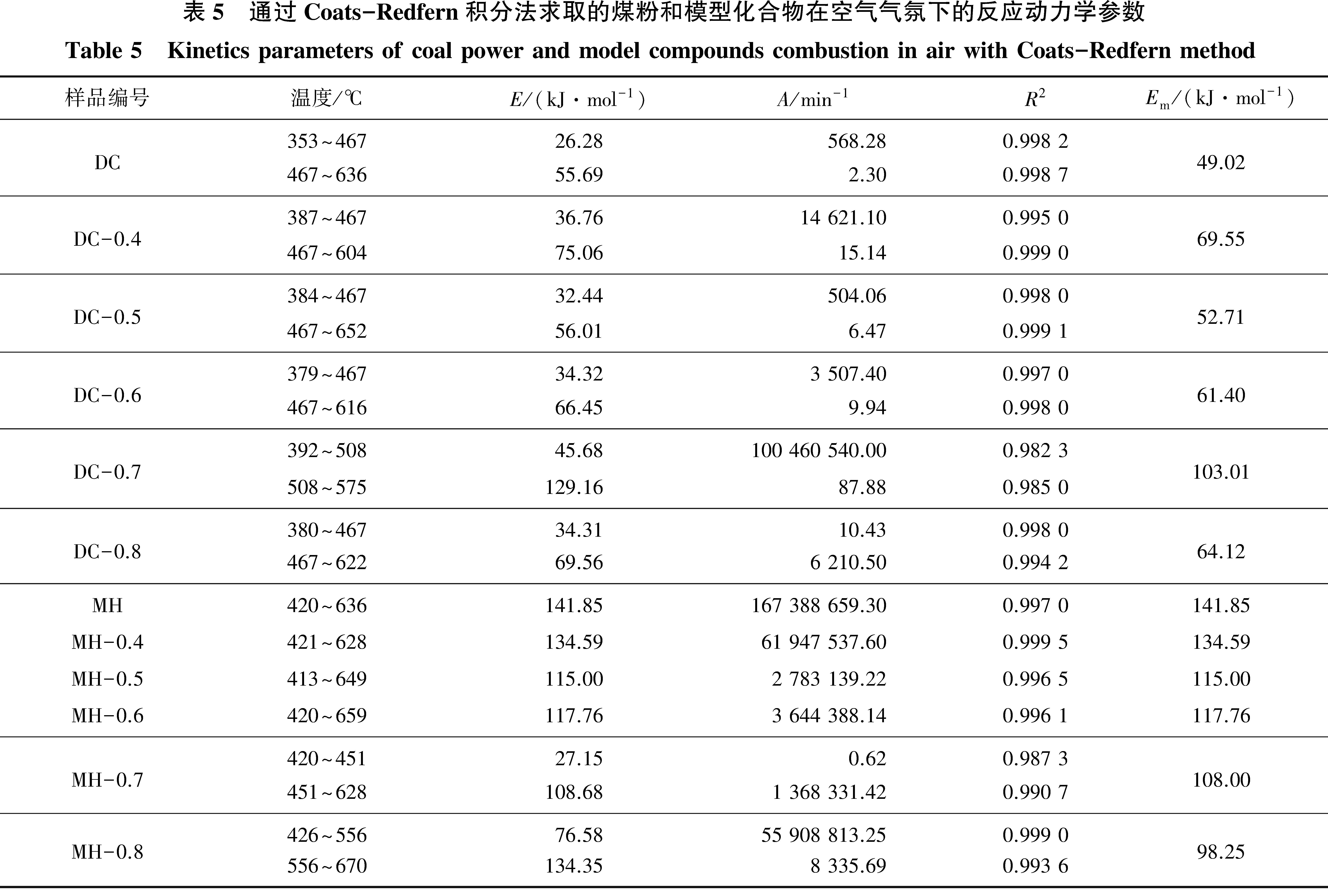 在各自的温度区间内,样品的Coats-Redfern 动力学分析曲线具有较好的线性关系,这与假设煤粉/模型化合物在空气气氛下的反应为1 级反应是一致的。 R2 =0.95 ~0.99,证明用Coats-Redfern 积分法计算的煤粉/模型化合物动力学参数可靠。 计算燃烧反应的活化能E 和指前因子A,见表5。