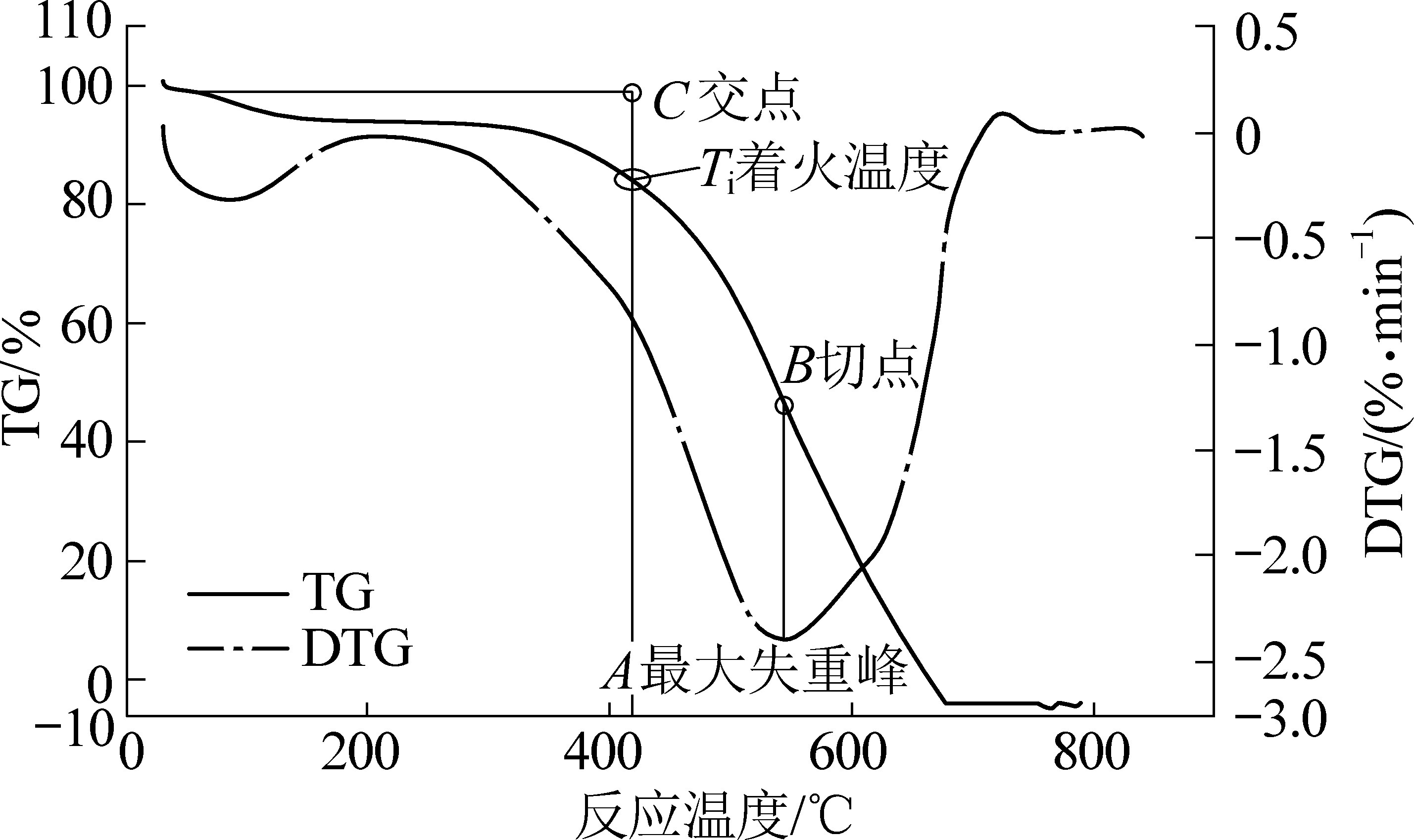 从TG-DTG 曲线可以获得着火温度(Ti)、燃尽温度(Tb)、最大燃烧速率和综合燃烧特性指数(S)等燃烧特性参数。 通过TG-DTG 确定Ti,如图1 所示。 过DTG 曲线的峰值点A 作X 轴的垂线与TG曲线交于点B,过点B 作TG 曲线的切线交TG 失重开始时的平行线于点C,C 点所对应的温度即Ti。