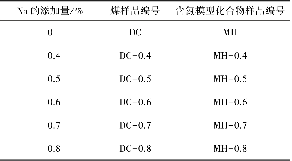 Na 的添加量/% 煤样品编号 含氮模型化合物样品编号0 DC MH 0.4 DC-0.4 MH-0.4 0.5 DC-0.5 MH-0.5 0.6 DC-0.6 MH-0.6 0.7 DC-0.7 MH-0.7 0.8 DC-0.8 MH-0.8