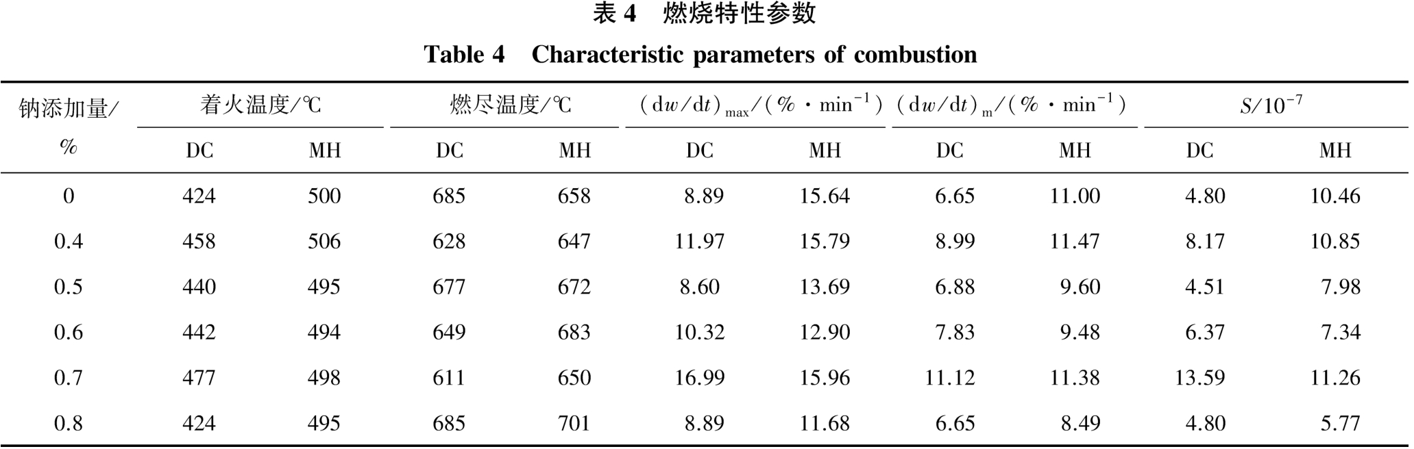 DC 与MH 系列样品燃料燃烧过程的着火温度、燃尽温度等燃烧特性指数计算结果,见表4。钠使DC 系列煤样的着火温度提高为6 ~53 ℃,抑制着火,但使固定碳燃尽温度降低为8 ~74 ℃。 钠的添加使DC 最大失重速率增大,使发生最大失重速率的温度降低。 钠的添加普遍使S增大,促进了燃烧反应。 效果最好的添加量为0.7%,S 为13.59;负载量为0.5%时则抑制了燃烧,S 为4.51。