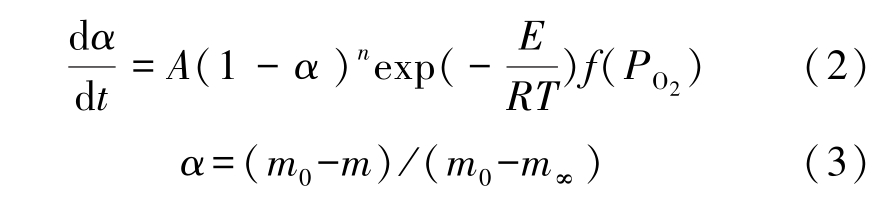 式中:A 为指前因子,min-1;E 为活化能,kJ/mol;n 为反应级数;f(PO2)为氧气分压有关的函数,在燃烧过程中氧分压基本不变,为常数;α 为煤粉样品的转化率,%;T 为热力学温度,K;R 为气体摩尔常数,J/(mol·K)。