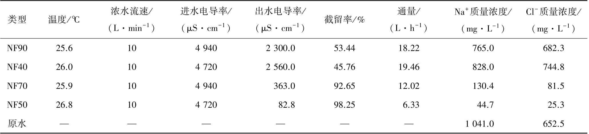 类型 温度/℃ 浓水流速/(L·min-1)进水电导率/(μS·cm-1)出水电导率/(μS·cm-1) 截留率/% 通量/(L·h-1)Na+质量浓度/(mg·L-1)Cl-质量浓度/(mg·L-1)NF90 25.6 10 4 940 2 300.0 53.44 18.22 765.0 682.3 NF40 26.0 10 4 720 2 560.0 45.76 19.46 828.0 744.8 NF70 25.9 10 4 940 363.0 92.65 12.02 130.4 81.5 NF50 26.8 10 4 720 82.8 98.25 6.33 44.7 25.3原水 — — — — — — 1 041.0652.5