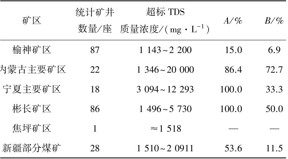 矿区 统计矿井数量/座超标TDS质量浓度/(mg·L-1) A/% B/%榆神矿区 87 1 143~2 200 15.0 6.9内蒙古主要矿区 22 1 346~20 000 86.4 72.7宁夏主要矿区 18 3 094~12 293 100.0 33.3彬长矿区 86 1 496~5 730 100.0 50.0焦坪矿区 1 ≈1 518 — —新疆部分煤矿 28 1 510~2 0911 53.6 11.5