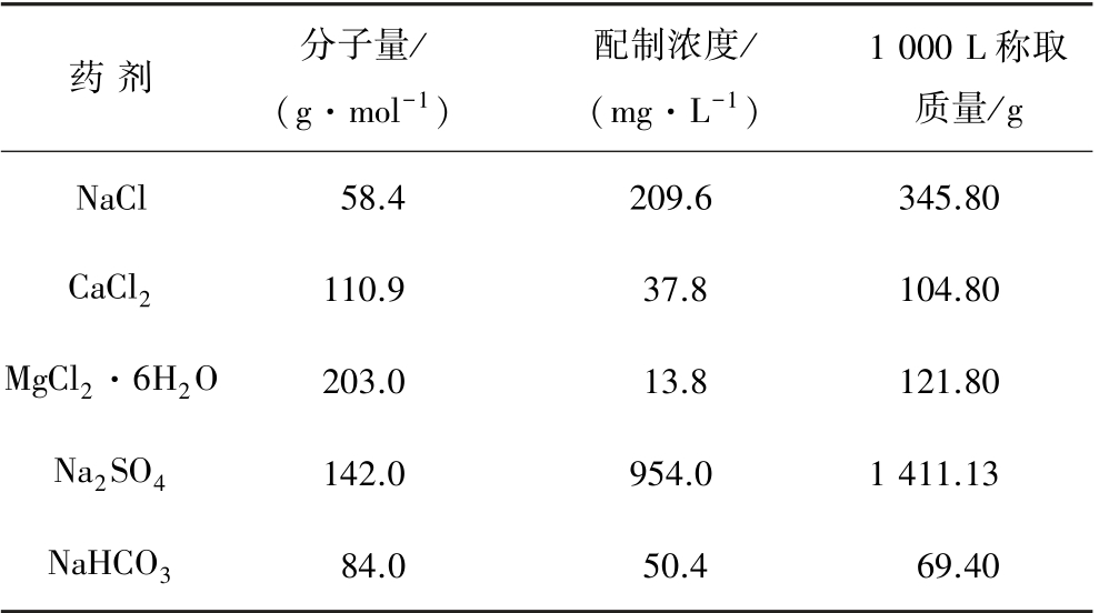 药剂 分子量/(g·mol-1)配制浓度/(mg·L-1)1 000 L 称取质量/g NaCl 58.4 209.6 345.80 CaCl2 110.9 37.8 104.80 MgCl2·6H2O 203.0 13.8 121.80 Na2SO4 142.0 954.0 1 411.13 NaHCO3 84.0 50.4 69.40