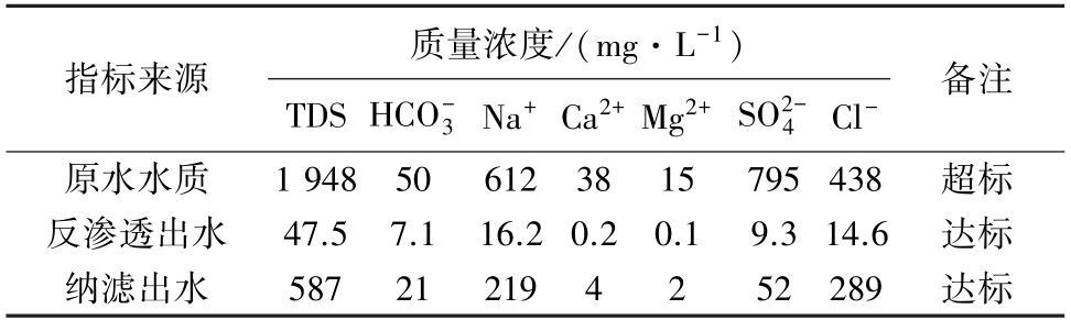指标来源 质量浓度/(mg·L-1)TDS HCO-3 Na+ Ca2+Mg2+ SO2-4 Cl-备注原水水质 1 948 50 612 38 15 795 438 超标反渗透出水 47.5 7.1 16.2 0.2 0.1 9.3 14.6 达标纳滤出水 587 21 219 4 2 52 289 达标