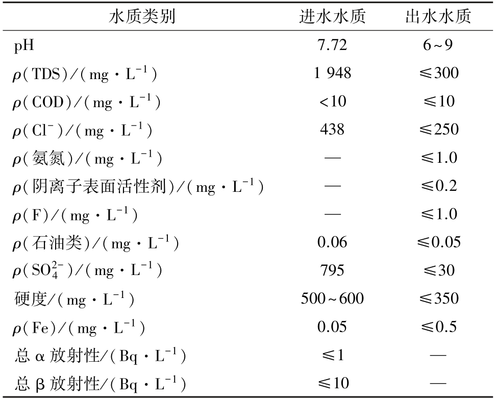 水质类别 进水水质 出水水质pH 7.72 6~9 ρ(TDS)/(mg·L-1) 1 948 ≤300 ρ(COD)/(mg·L-1) <10 ≤10 ρ(Cl-)/(mg·L-1) 438 ≤250 ρ(氨氮)/(mg·L-1) — ≤1.0 ρ(阴离子表面活性剂)/(mg·L-1) — ≤0.2 ρ(F)/(mg·L-1) — ≤1.0 ρ(石油类)/(mg·L-1) 0.06 ≤0.05 ρ(SO2-4 )/(mg·L-1) 795 ≤30硬度/(mg·L-1) 500~600 ≤350 ρ(Fe)/(mg·L-1) 0.05 ≤0.5总α 放射性/(Bq·L-1) ≤1 —总β 放射性/(Bq·L-1) ≤10 —
