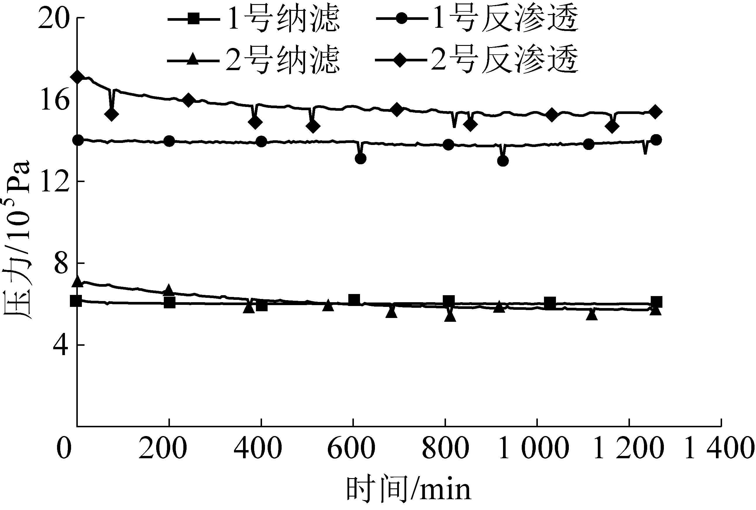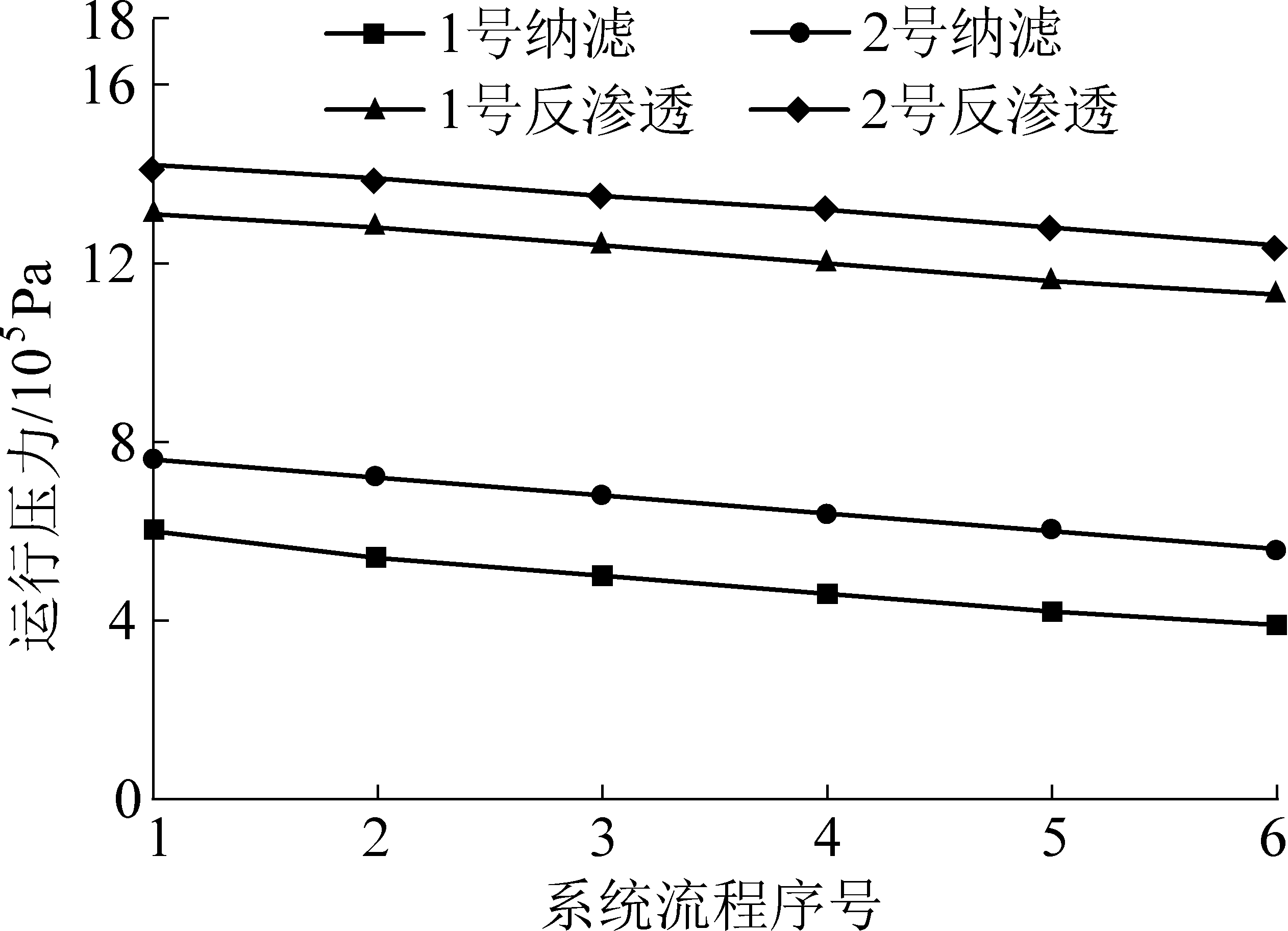 工艺对比分析:反渗透系统的运行压力一般在1.4~1.6 MPa,而纳滤仅为0.6 ~0.7 MPa,预处理费由0.20 元/t 降至0.12 元/t,功耗由1.18 kW·h 降低至0.80 kW·h,最终成本由1.48 元/t 降低为1.09元/t。
