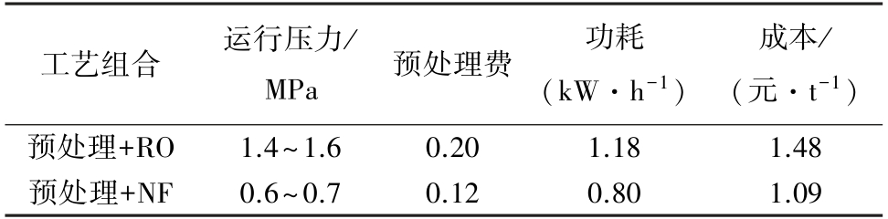 工艺组合 运行压力/MPa 预处理费 功耗(kW·h-1)成本/(元·t-1)预处理+RO 1.4~1.6 0.20 1.18 1.48预处理+NF 0.6~0.7 0.12 0.80 1.09