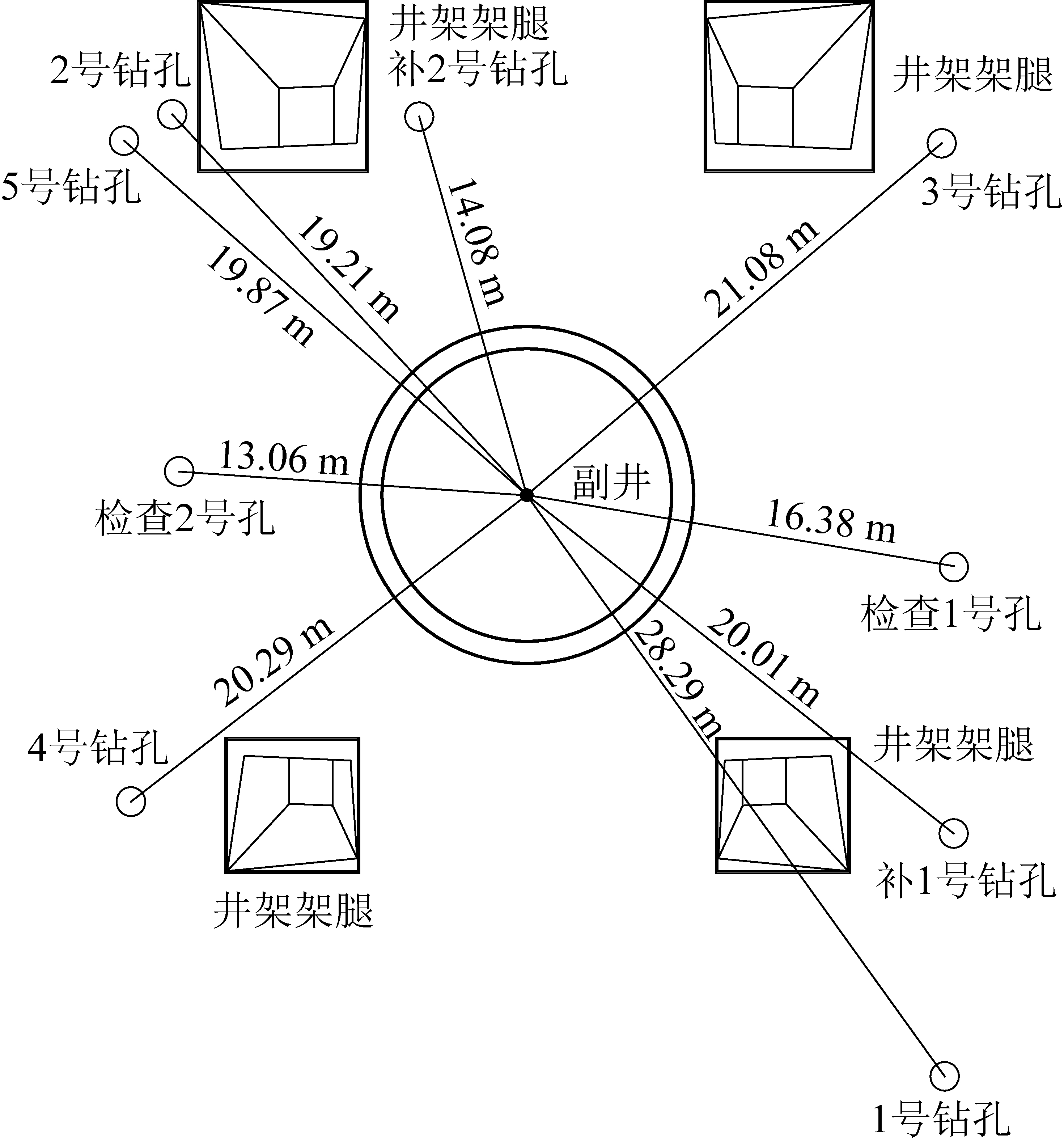 图5 副井井筒探注钻孔平面布置 Fig.5 Plane layout of exploration drilling of auxiliary shaft