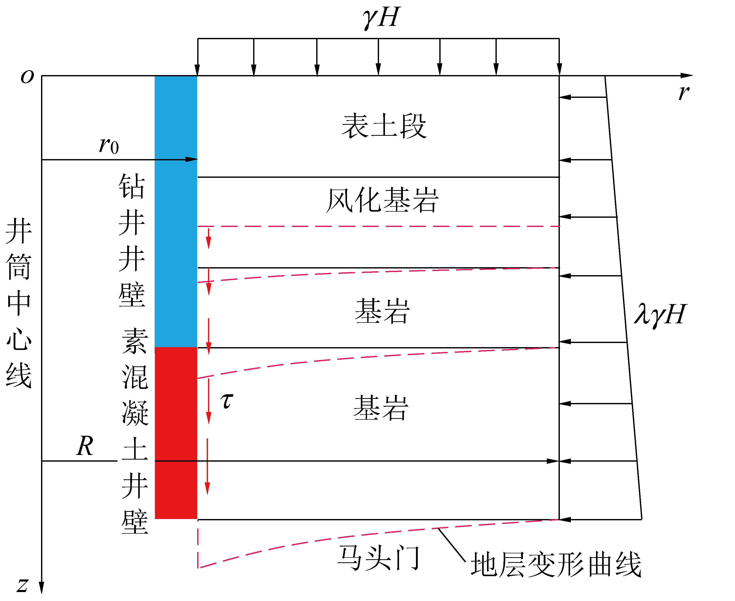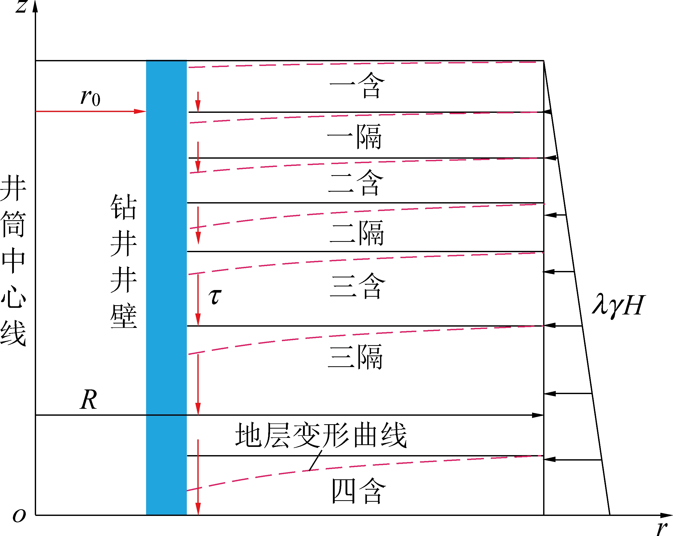 z—深度;r—水平距离;R—影响半径;r0—井外半径;γ—岩层容重;H—上覆岩层高度;λ—侧压系数;τ—竖向剪切