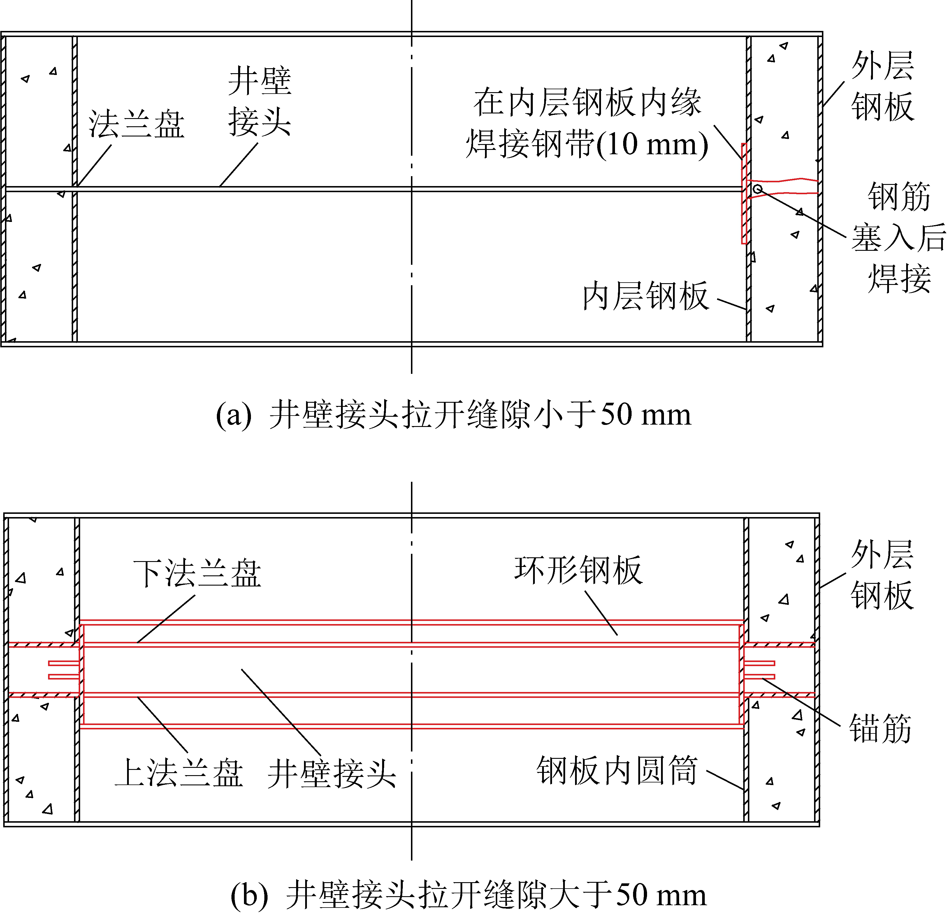 2)对出现接头法兰盘局部拉开或全部拉开、水平错动等破坏的钢板井壁,因其水平承载力未受影响,本着恢复其接头处防水性能原则制定修复设计(图7)。具体为:当井壁接头法兰盘拉开的缝隙Δ<50 mm时,在内缘塞入环行钢筋进行周圈焊接后,将微膨胀水泥浆注入接头缝隙,若为钢板井壁需沿其内缘加焊钢带,并做防腐处理;Δ>50 mm时,清理其填充物及内缘焊缝后,沿井壁内缘上下法兰盘间贴焊一圈设有适量径向锚筋的环形钢板,并在钢板上预留浇注孔,通过钢板上的预留孔浇筑C80高强细石混凝土。