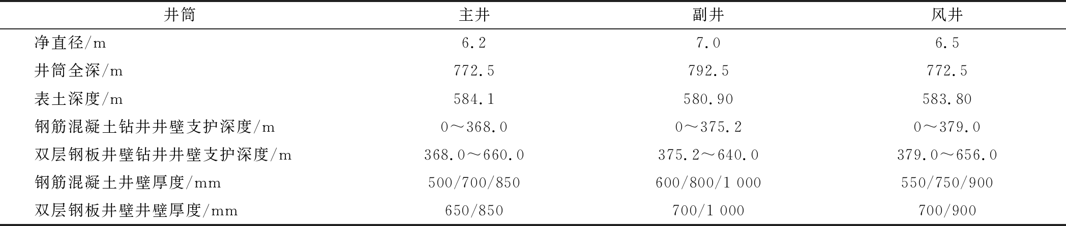 井筒主井副井风井净直径/m6.27.06.5井筒全深/m772.5792.5772.5表土深度/m584.1580.90583.80钢筋混凝土钻井井壁支护深度/m 0~368.00~375.20~379.0双层钢板井壁钻井井壁支护深度/m368.0~660.0375.2~640.0379.0~656.0钢筋混凝土井壁厚度/mm500/700/850600/800/1 000550/750/900双层钢板井壁井壁厚度/mm650/850700/1 000700/900