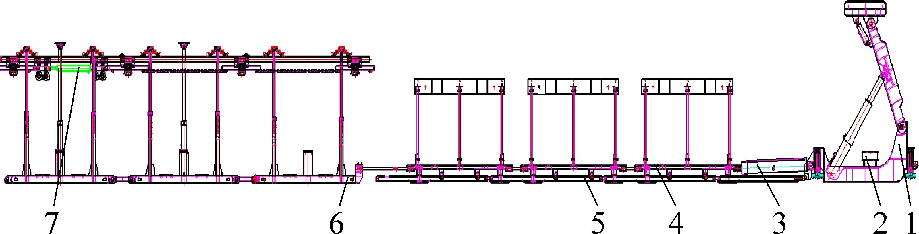 1—运输车;2—撑顶立柱;3—悬臂梁;4—工字钢梁;5—步进推移装置;6—管缆;7—管缆托架