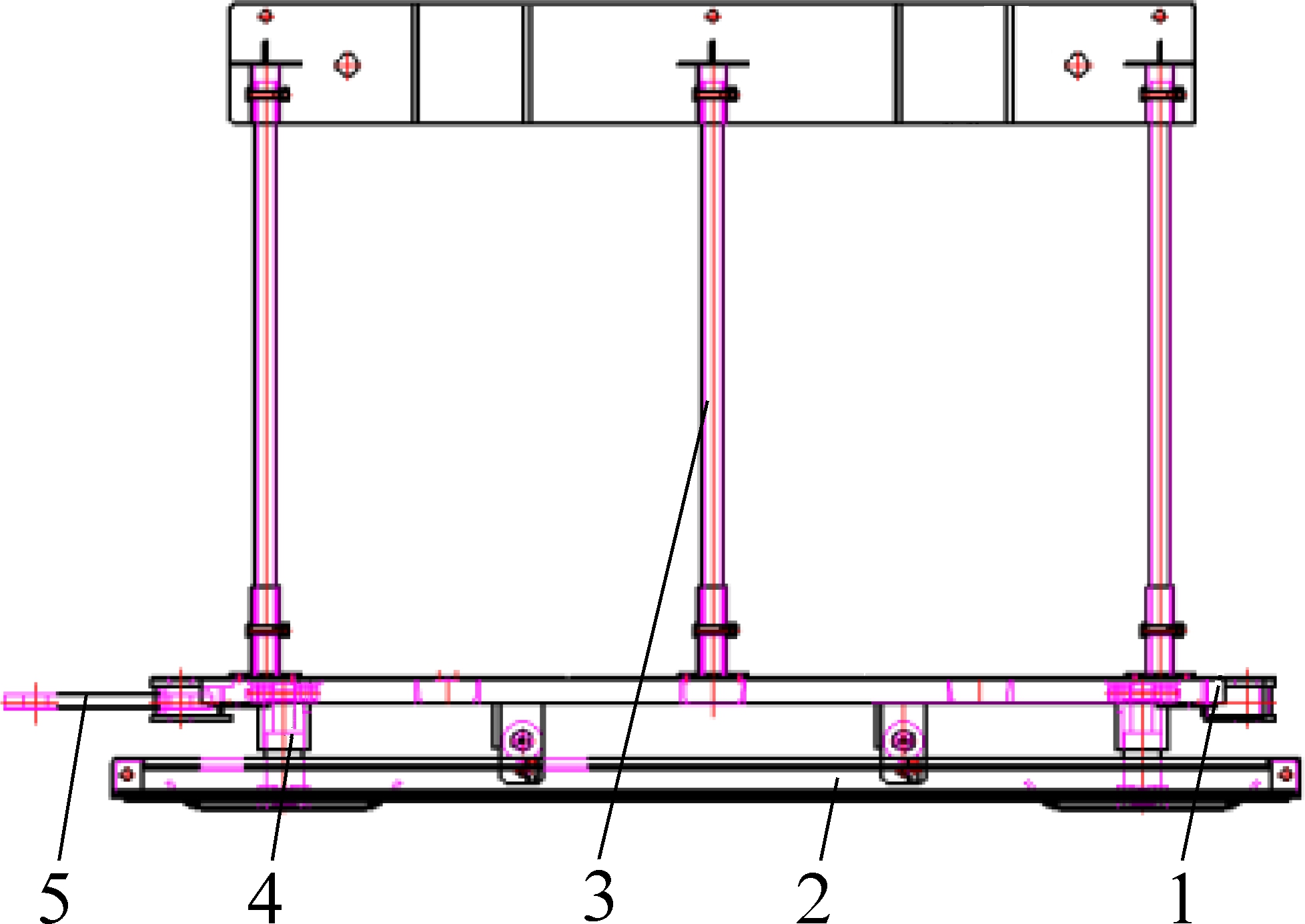 1—平板车;2—轨道;3—管揽储存架;4—升降装置;5—连接装置