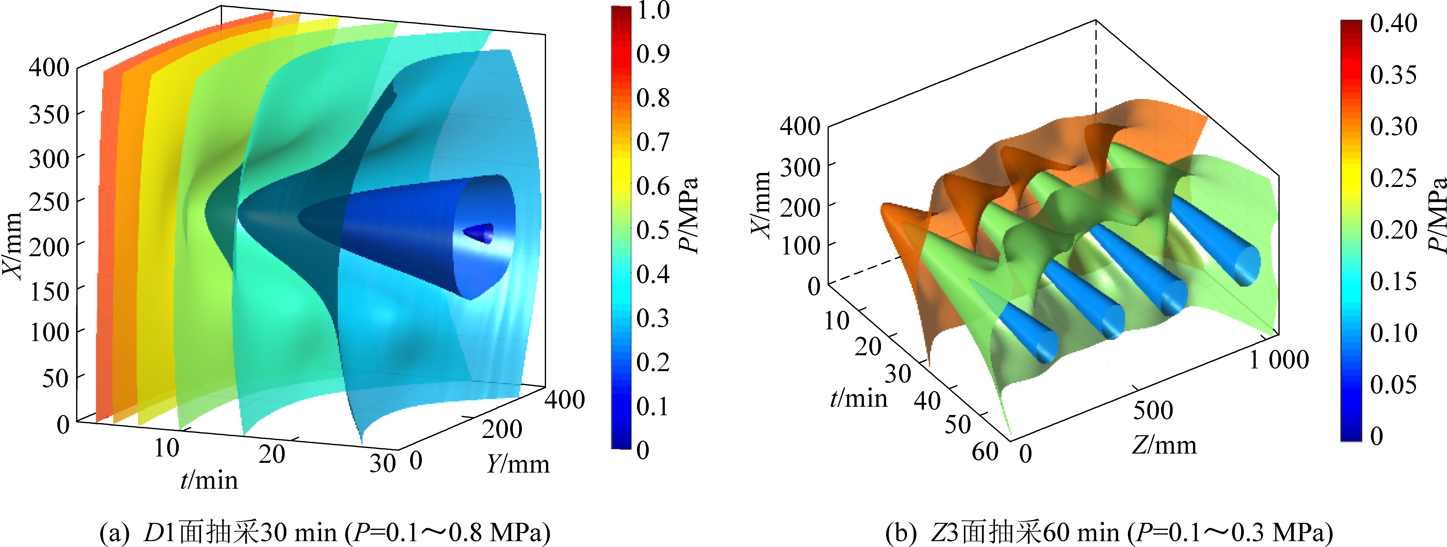 2)瓦斯压力等压面:图3中瓦斯压力云图只能展示特定时刻瓦斯压力分布规律,为了分析瓦斯压力分布随着抽采时间的演化特征,以4个钻孔同时抽采为例,绘制瓦斯抽采过程中瓦斯压力等压面,如图4所示。图4a为抽采前30 min平行钻孔D1面瓦斯压力等压面,由左到向分别为P=0.8、0.7、0.6、0.5、0.4、0.3、0.2、0.1 MPa等压面,可知:平行钻孔的瓦斯压力等压面总是在(x=200,y=250)处开始出现,对应钻孔抽采段中部,表明此处瓦斯压力下降最快;随着抽采的进行,瓦斯压力等压面对应瓦斯压力值逐渐减小,且在抽采前期瓦斯压力等压面出现时间较短(如P=0.8、0.7、0.6、0.5、0.4 MPa等压面),很快被较小瓦斯压力值对应等压面取代,而较小瓦斯压力值对应等压面持续时间较长(如P=0.3、0.2、0.1 MPa等压面),表明瓦斯压力在抽采前期下降较快,而后缓慢下降;图4b为抽采前60 min垂直钻孔Z3面瓦斯压力等压面,由左到向分别为P=0.3、0.2、0.1 MPa等压面,可知:在抽采前期,瓦斯压力等压面近似呈圆锥面分布,且相互独立(如P=0.3 MPa等压面前期),而随着抽采的进行,相邻等压面慢慢出现合并,并出现更低瓦斯压力对应的4个相互独立等压面(如P=0.2 MPa等压面前期),随着合并的瓦斯压力等压面逐渐扩展到整个Z3面,后出现的4个相互独立等压面也开始出现新一轮的合并及扩展,此过程不断往复,直到抽采结束。