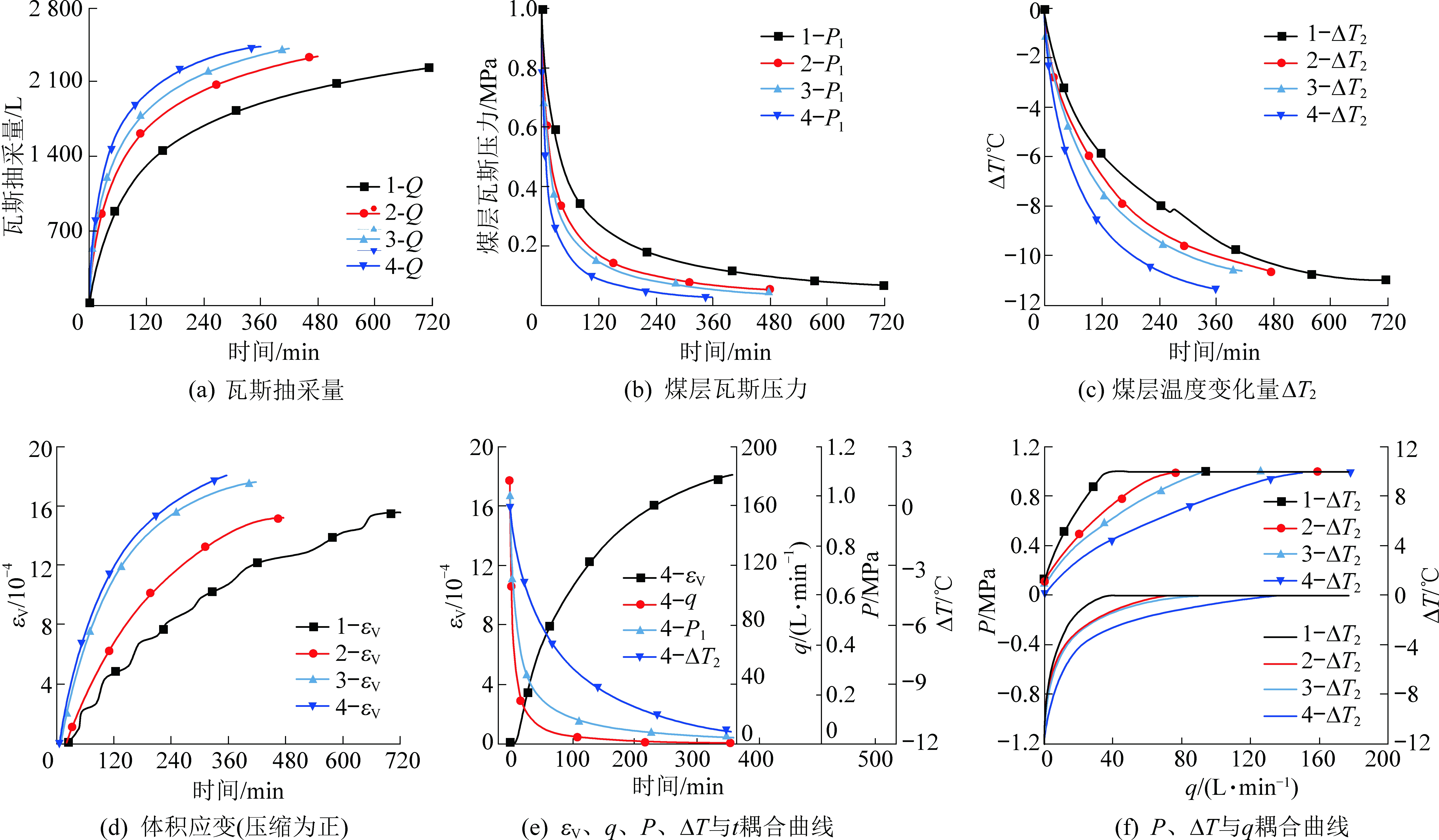 分别选取4次试验过程中瓦斯抽采量Q、体积应变εV、瓦斯压力P、煤层温度T以及瓦斯流量q等参数进行对比分析,同时以编号“1—4”区分不同试验,如图2所示。由图2a可知,随着钻孔数量的增加抽采相同时间对应抽采量也相应增加,其中抽采6 h后4组试验对应抽采量分别为1 901、2 219、2 362 和 2 450 L,钻孔数量由1个增加到2、3、4个时,抽采量分别增加了16.7%、24.3%、28.8%;而4组试验结束后,对应抽采时长分别约为12、8、7、6 h,对应累计抽采量分别为2 238、2 344、2 424、2 450 L。可见随着抽采钻孔数量的增加,相同时间内抽采量也随之增加,而对于钻孔数量较少试验,随着其长时间的持续抽采,对应抽采量也能逐渐接近多钻孔抽采结束时对应抽采量。即增加钻孔数量能有效增加瓦斯抽采量、减少抽采时间,从而显著提高瓦斯抽采效率;由图2b可知,不同试验对应P1均表现为前期下降较快,而后平稳下降的整体趋势,且钻孔数量越多下降越迅速,试验结束后对应瓦斯压力均接近大气压;吸附瓦斯解吸必然导致煤层温度下降,如图3c所示,抽采结束后T2分别下降11.3、10.6、10.7和11.0 ℃;瓦斯抽采过程中,瓦斯压力下降使得有效应力增加,导致煤体压缩和孔裂隙的收缩闭合,同时吸附瓦斯的解吸会引起基质收缩,另一方面瓦斯解吸引起温度的下降会进一步加剧煤骨架的变形,以上3个方面因素综合影响导致煤体的变形,如图2d所示,可知抽采钻孔数量越多,对应体积应变越大。