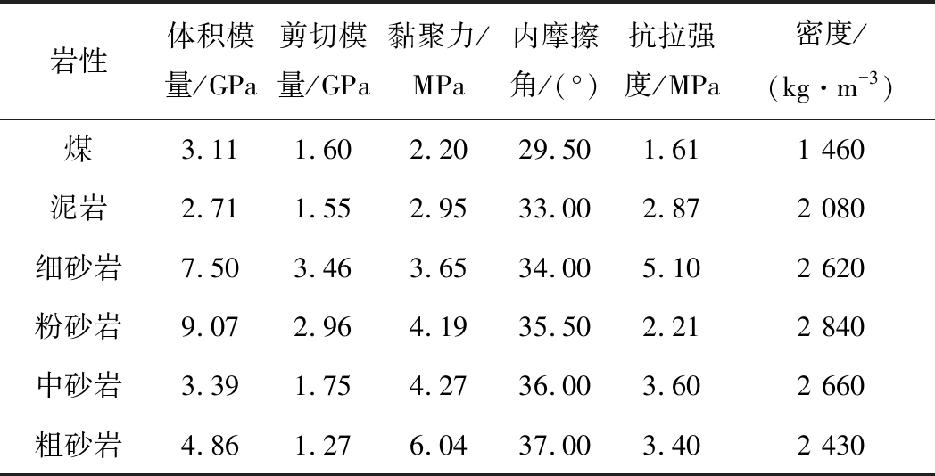 岩性体积模量/GPa剪切模量/GPa黏聚力/MPa内摩擦角/(°)抗拉强度/MPa密度/(kg·m-3)煤3.111.602.2029.501.611 460泥岩2.711.552.9533.002.872 080细砂岩7.503.463.6534.005.102 620粉砂岩9.072.964.1935.502.212 840中砂岩3.391.754.2736.003.602 660粗砂岩4.861.276.0437.003.402 430