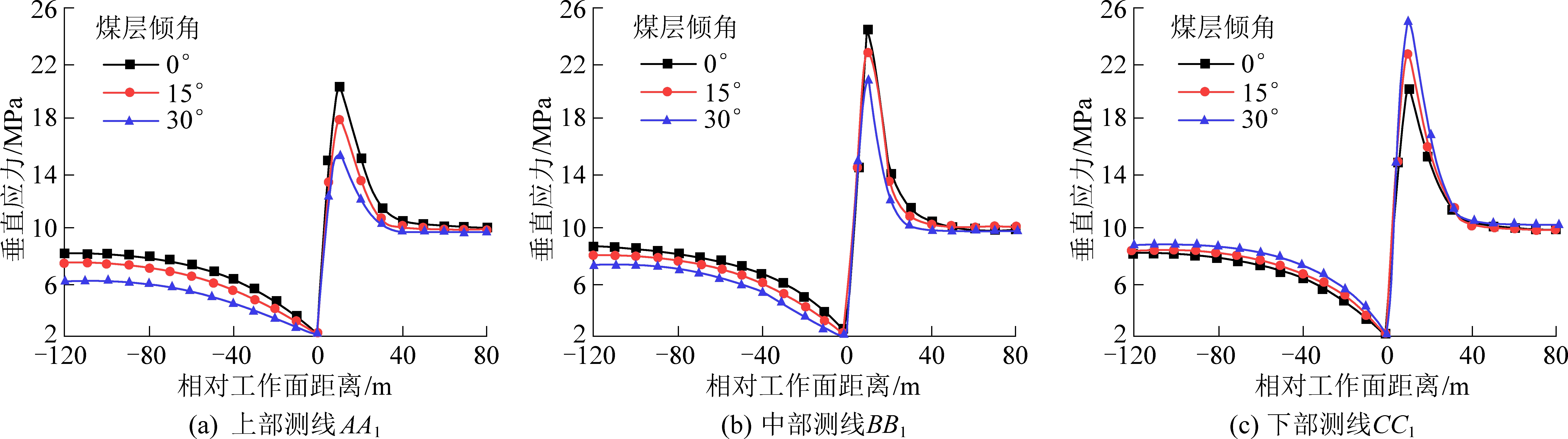 采场上部、中部及下部位置(即测线AA1、BB1、CC1)提取的垂直应力分布如图5所示,工作面推进方向为正方向。可见,工作面前方和采空区的垂直应力分布随着煤层倾角的变化存在差异。煤层倾角变化对工作面前方支承应力影响显著,随着煤层倾角增大,在倾向上、中部,工作面超前支承应力集中系数呈现减小趋势,在倾向下部则呈现增大趋势。