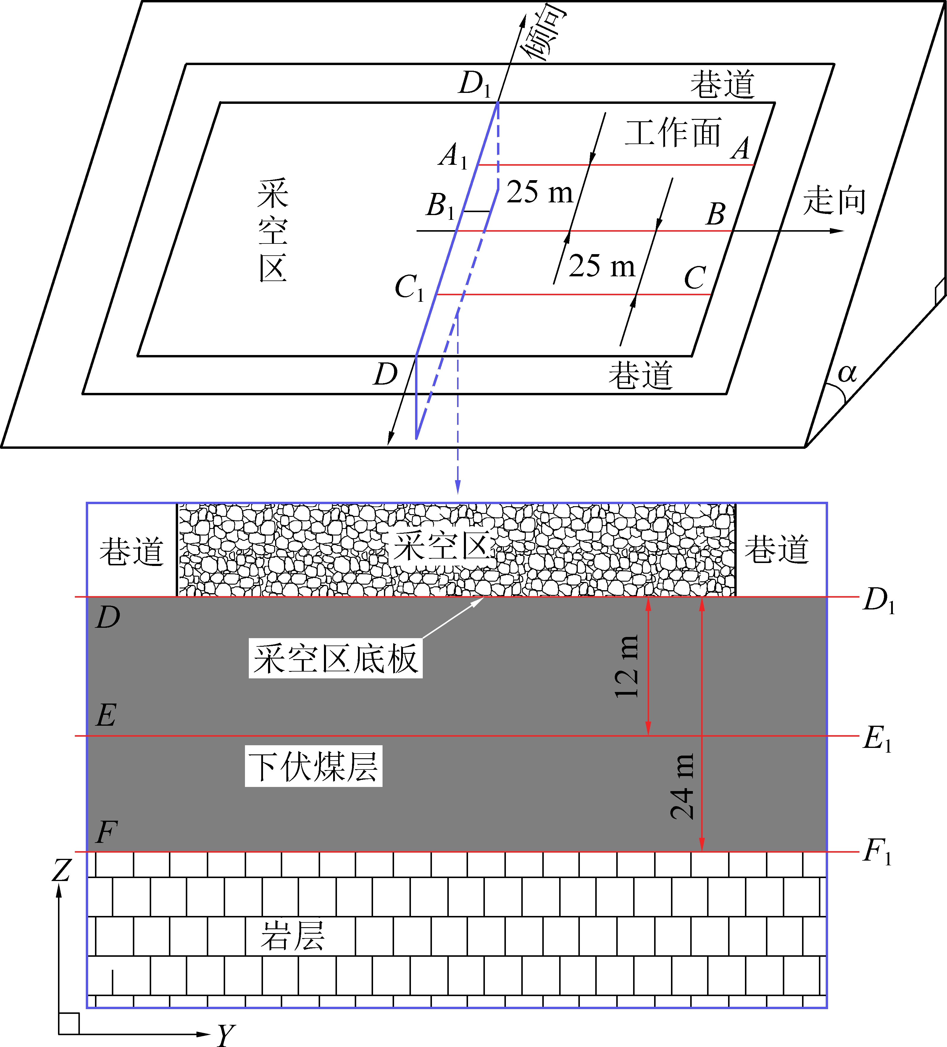 为获得准确的采空区底板应力分布规律,使用FLAC3D内置hist函数,对采空区底板不同深度煤层应力进行监测。测线(监测点构成的线)布置如图4所示,其中,α为煤层倾角。