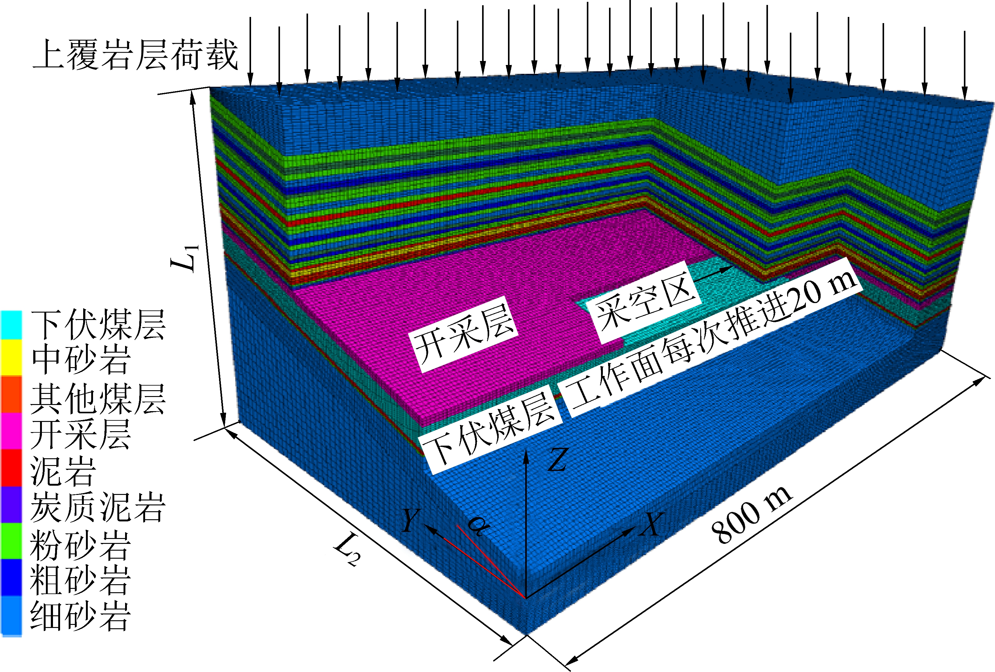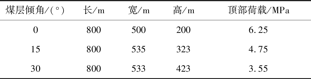 煤层倾角/(°)长/m宽/m高/m顶部荷载/MPa08005002006.25158005353234.75308005334233.55