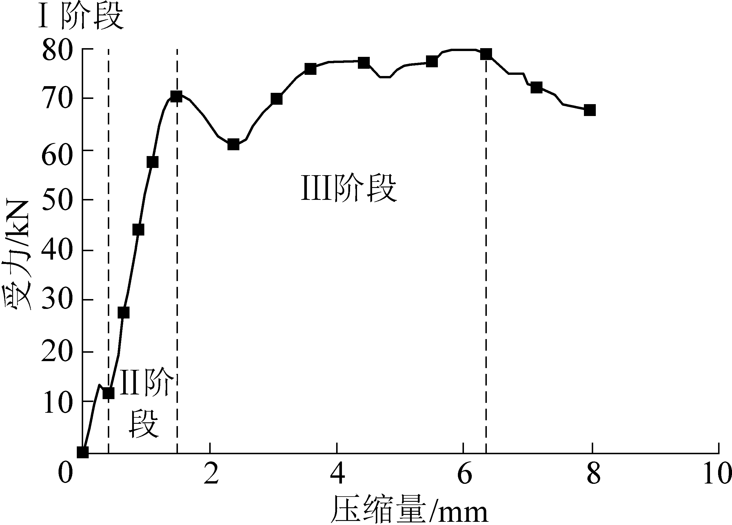 堆积角90°试样变形和受力关系如图5所示,由图5可知,当高浓度浆液充填墩柱试样堆积角为90°时,即圆柱试样,其抗压过程中受力和变形曲线与典型的受压应力-应变曲线相近。