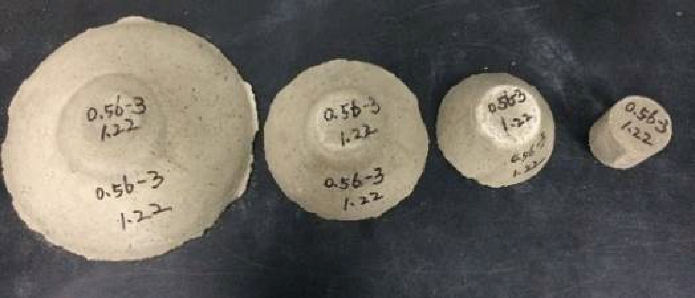 试验研究堆积角对高浓度浆液充填圆台强度的影响规律,利用3D打印技术,打印制作圆台试验模具来模拟不同堆积角充填圆台,模具为圆台形套筒,顶部内径为50 mm,高度为50 mm,模具堆积角度分别为30°、45°、60°和90°。按照浆液配比,配制高浓度浆液,将浆液倒入模具内,静置1 d后,脱模,将试样放在水中进行养护,待龄期为7 d时,利用WAW-300微机控制电液伺服万能试验机,进行单轴抗压试验,制成的试样照片如图1所示。每组试验制作3个平行试样,试验结果取平均值。