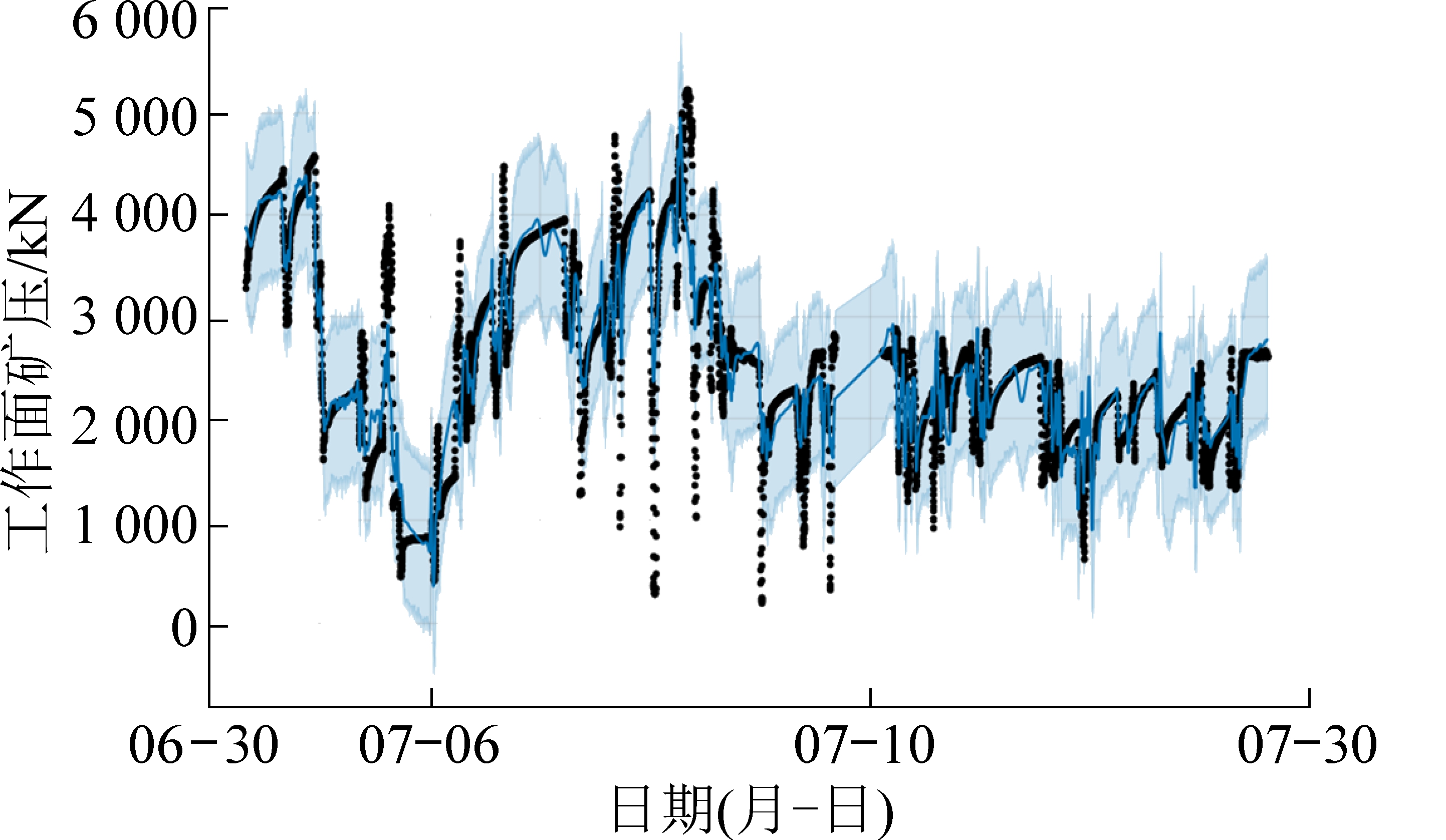 —置信区间; 不存在黑色圆点的数据区间表示对矿压趋势的预测区间