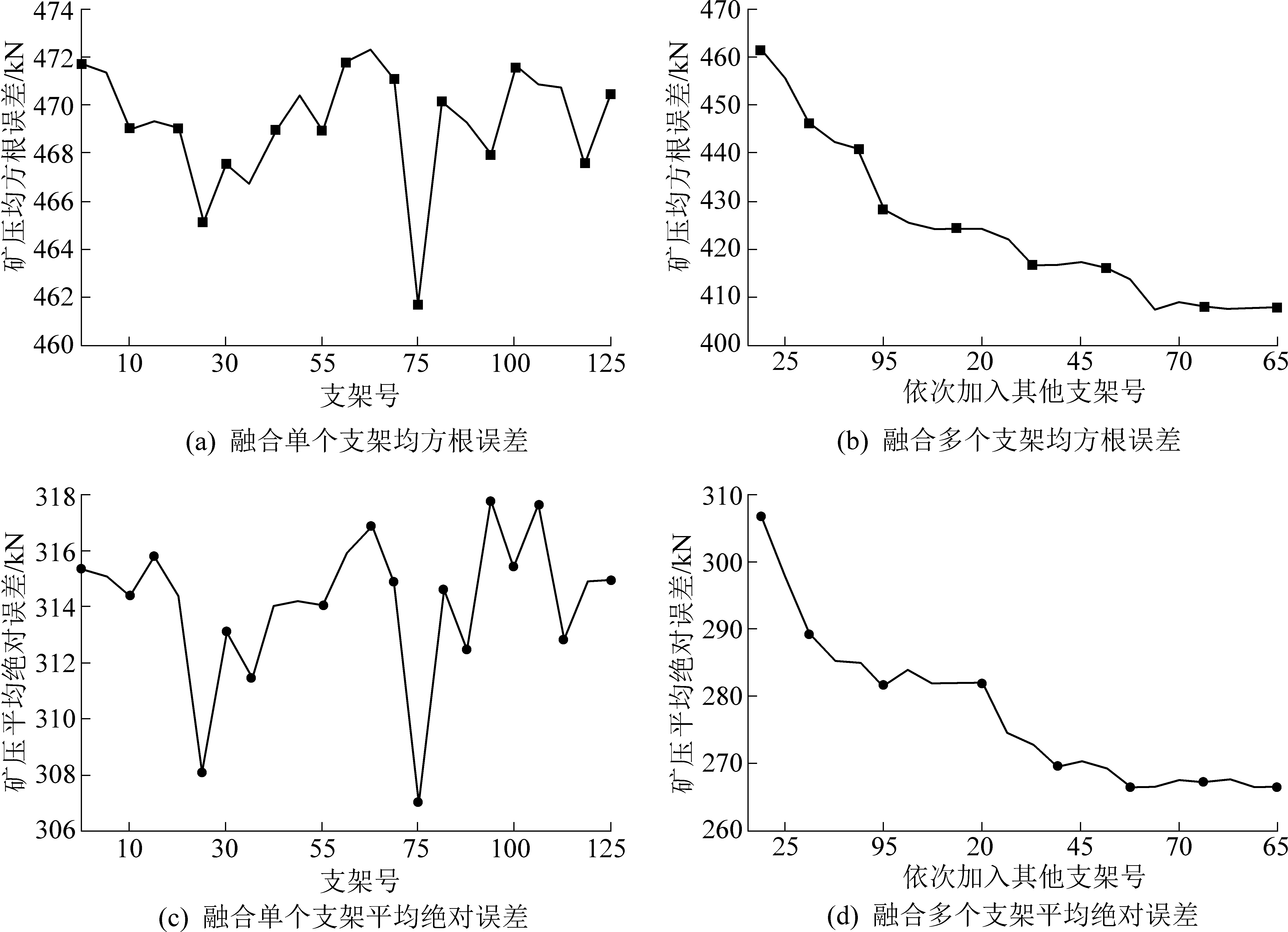 图7a是将单个支架作为额外的回归变量添加到Prophet模型进行预测的RMSE和MAE,可以明显看到25和75号支架对50号支架的影响力度较大;图7b是根据图7a中的结果排序后依次融合到Prophet模型的结果,随着支架数量的增加,RMSE和MAE逐渐减少,当融合到105号支架时RMSE减少了64.307 kN(13.6%),MAE减少了48.766 kN(15.5%),之后误差基本不再变化。结果表明:融合相邻多个支架矿压数据作为附加的回归变量添加到Prophet模型的线性部分,可以提高Prophet模型的预测精度。