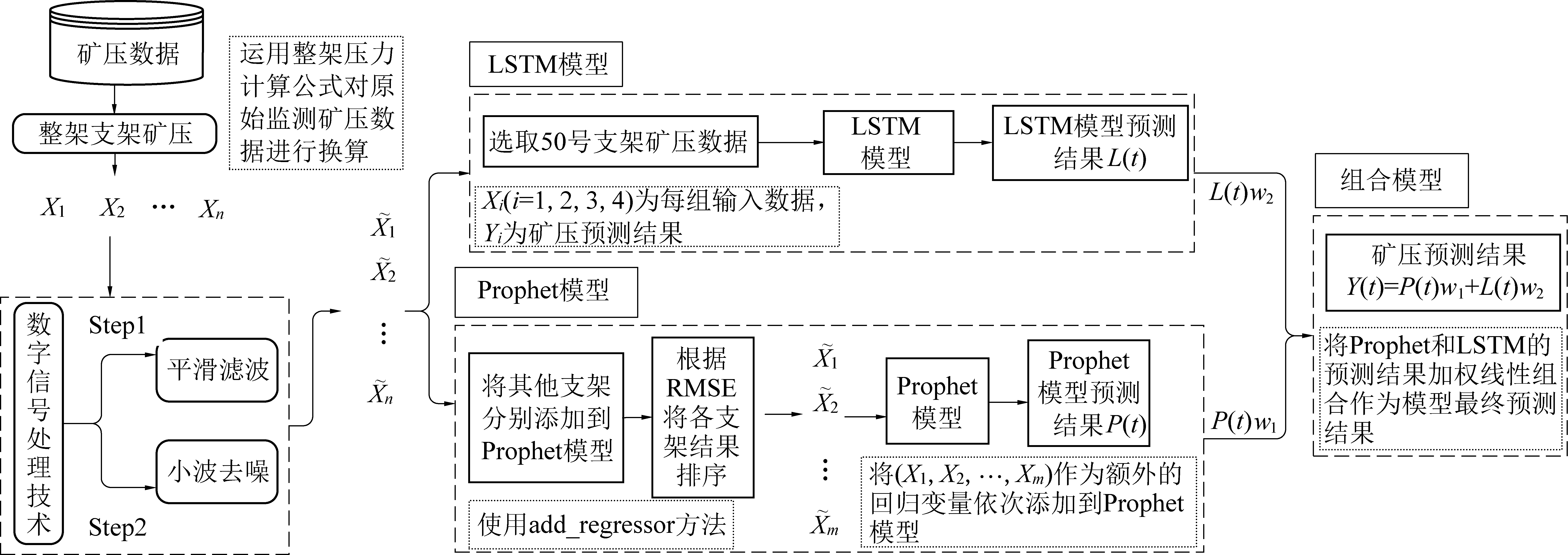 以工作面支架矿压显现规律为研究对象,结合数字信号处理技术,运用Prophet和LSTM深度学习方法分别对支架矿压时序数据进行预测,然后将2个单项模型预测结果线性加权叠加得到最终的Prophet+LSTM组合模型的预测结果。工作面矿压预测模型如图1所示,主要包括3个部分。