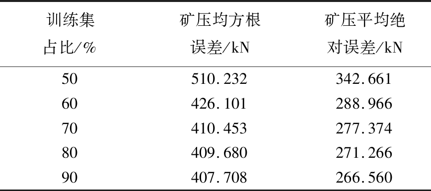 训练集占比/%矿压均方根误差/kN矿压平均绝对误差/kN50510.232342.66160426.101288.96670410.453277.37480409.680271.26690407.708266.560