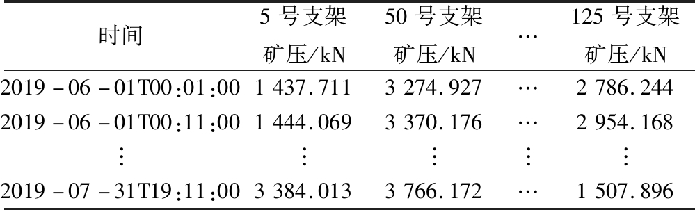 时间5号支架矿压/kN50号支架矿压/kN…125号支架矿压/kN2019-06-01T00:01:001437.7113274.927…2786.2442019-06-01T00:11:001444.0693370.176…2954.168︙︙︙︙︙2019-07-31T19:11:003384.0133766.172…1507.896