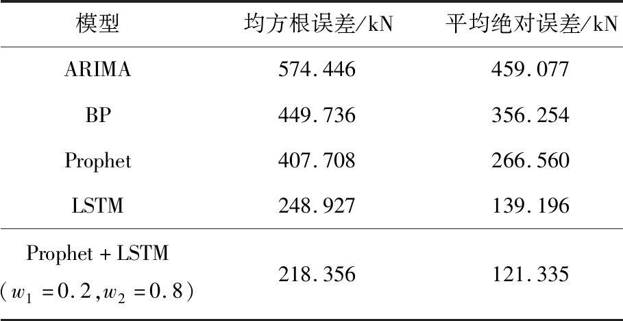 模型均方根误差/kN平均绝对误差/kNARIMA574.446459.077BP449.736356.254Prophet407.708266.560LSTM248.927139.196Prophet+LSTM(w1=0.2,w2=0.8)218.356121.335