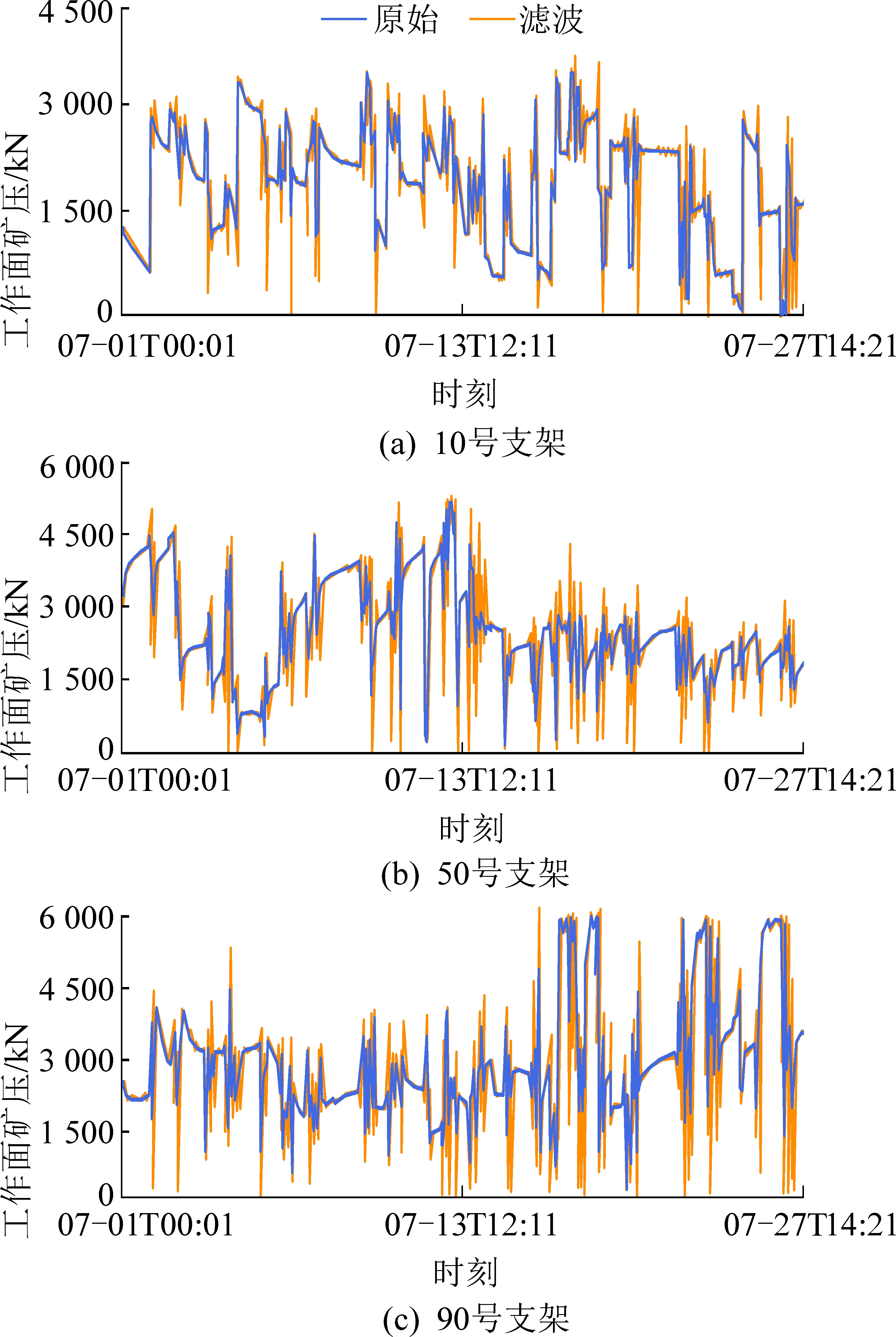 考虑到数字信号处理技术对结果的重要影响,对各支架矿压序列数据在应用数字信号处理前后进行了对比分析,如图4(2019年数据)所示。选取3个支架查看数字信号处理后矿压的变化情况,可以明显看到数据趋势更加平滑,噪声减少明显。