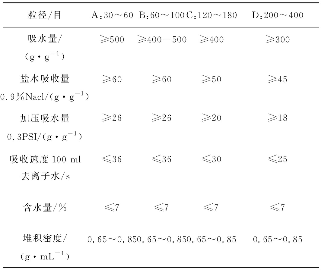 粒径/目A:30~60B:60~100C:120~180D:200~400吸水量/(g·g-1)≥500≥400-500≥400≥300盐水吸收量0.9%Nacl/(g·g-1)≥60≥60≥50≥45加压吸水量0.3PSI/(g·g-1)≥26≥26≥20≥18吸收速度100 ml去离子水/s≤36≤36≤30≤25含水量/%≤7≤7≤7≤7堆积密度/(g·mL-1)0.65~0.850.65~0.850.65~0.850.65~0.85