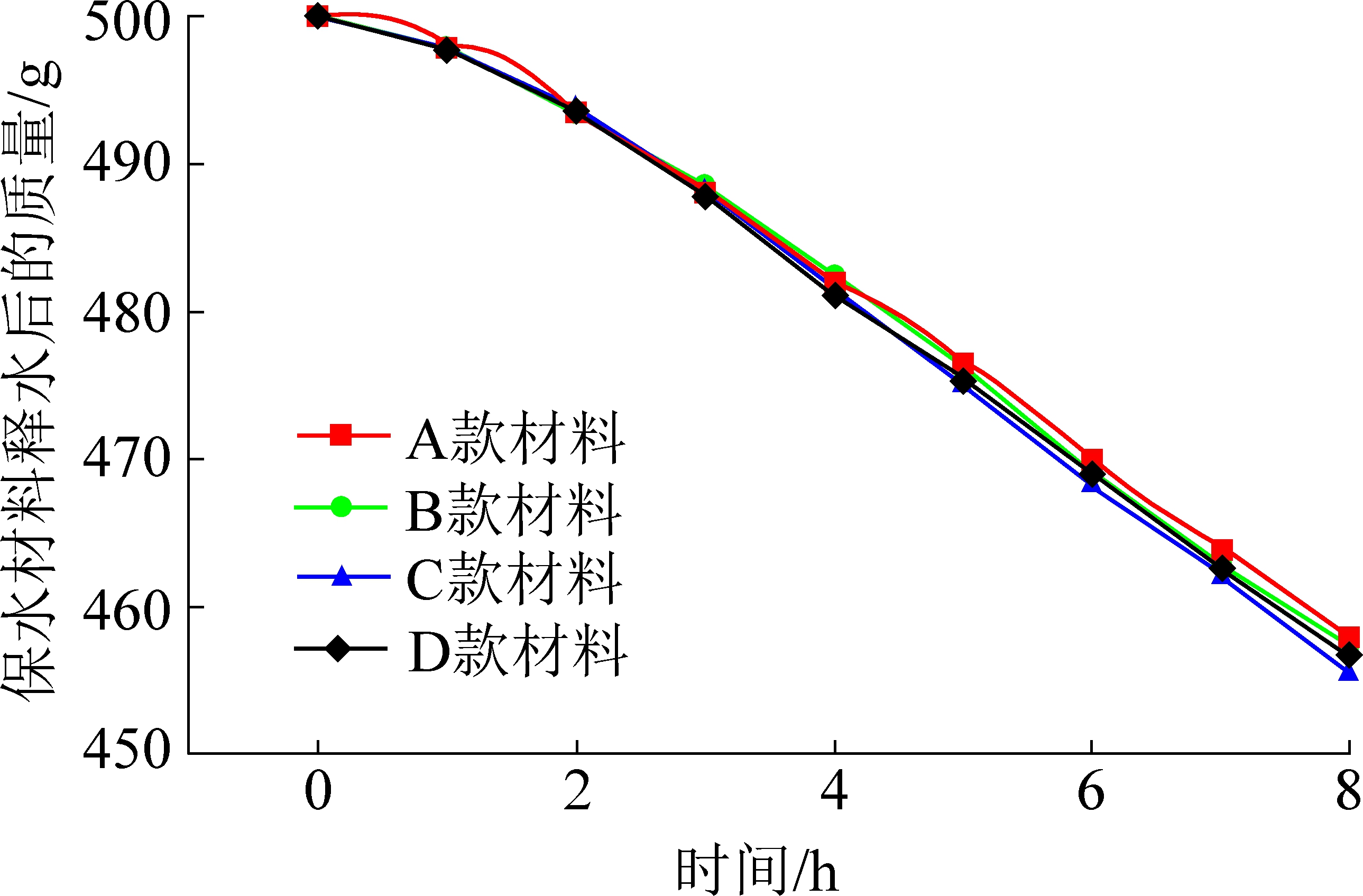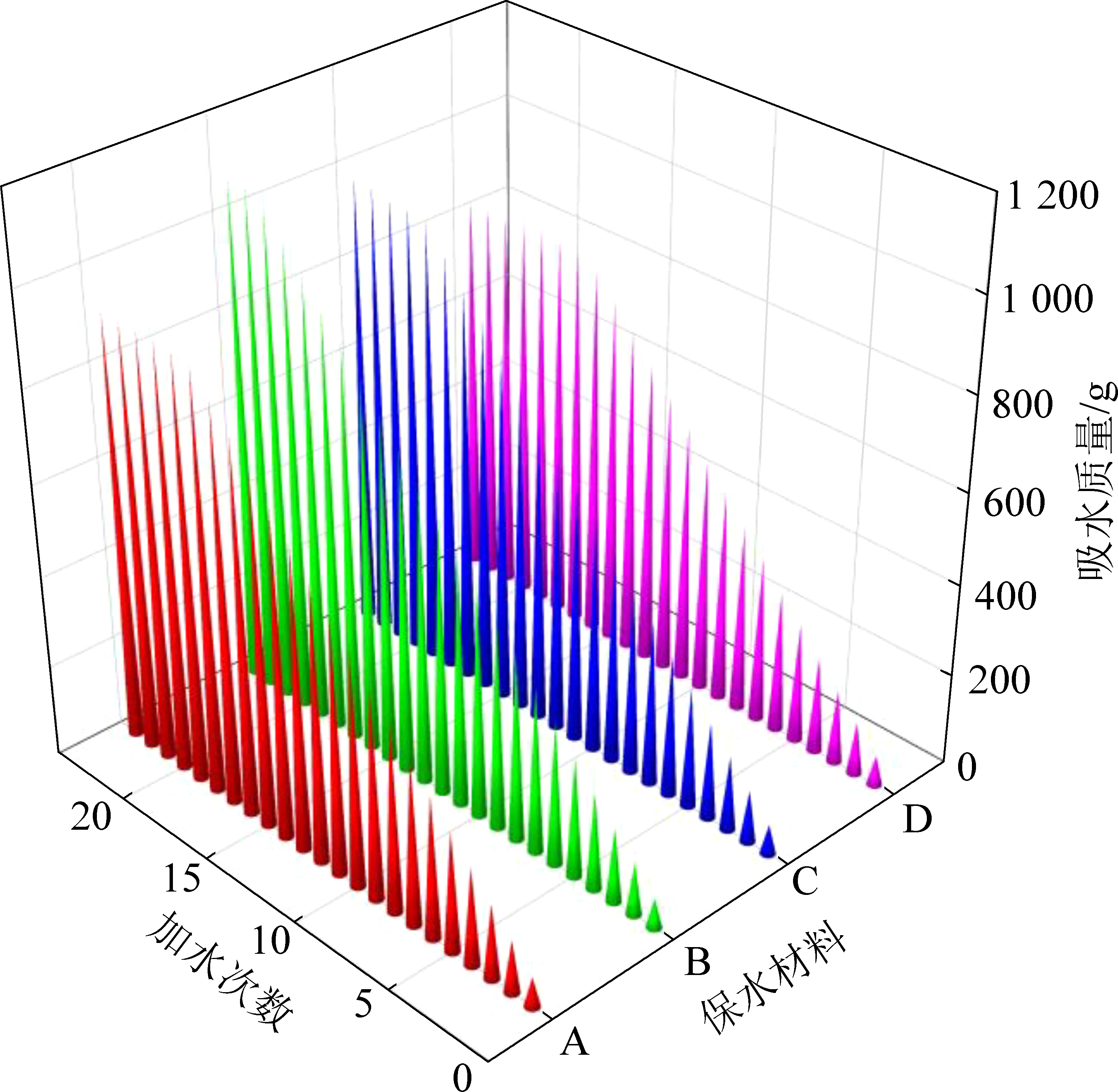 1)保水材料的吸水特性。通过试验1得到保水材料与加水次数、吸水质量的3维柱状关系,如图2所示。随着加水次数的增加,保水材料的吸水质量不断增大,直至保水材料吸水饱和时,其质量不再改变达到最大值,其吸水量由大到小依次为:B款、C款、A款、D款,其中A、C款保水材料的吸水质量相差不大,而B款保水材料的吸水质量达到1 089.86 g为4款材料中的最大值,D款保水材料的吸水质量达到844.14 g为4款材料中的最小值,说明B款保水材料的持水效果较好。