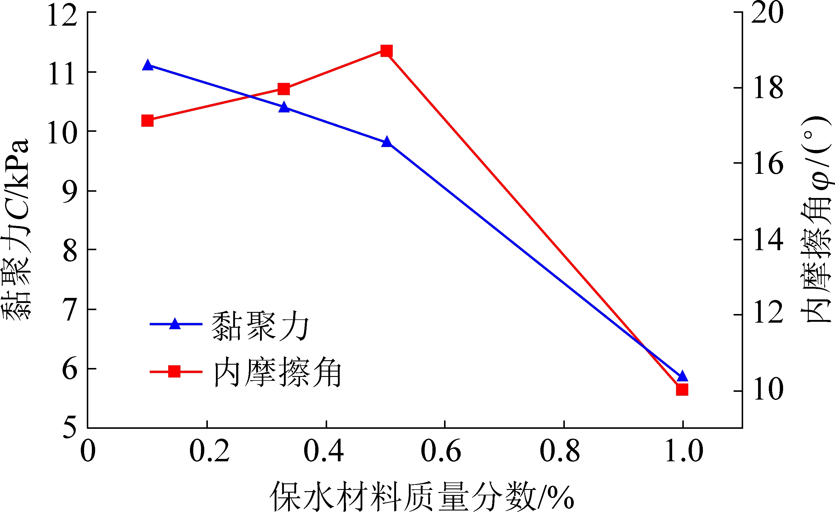 由于保水材料吸水膨胀,当进行直接剪切试验时,其白色颗粒在矿区原始表土中起到润滑作用,造成水分子在保水复垦土壤材料颗粒间形成完整水膜,削弱了微观结构间黏结力,使得破坏时需要克服的黏聚力减小,当保水材料含量越高时,其保水复垦土壤材料整体含水率越大,水的物理状态对保水复垦土壤材料的力学弱化作用显著,内摩擦角也减小。