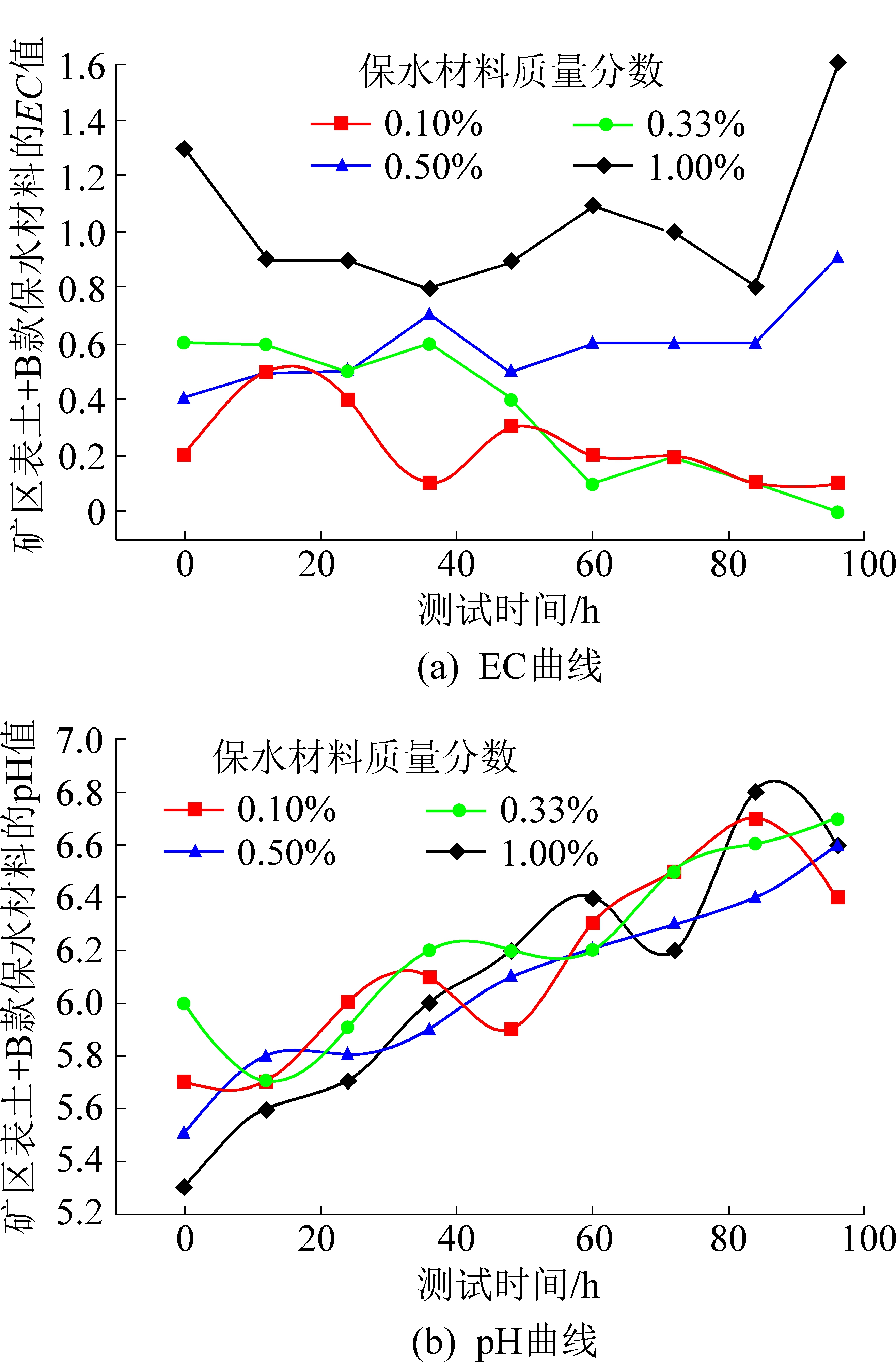 2)随着测试时间的增加,质量分数为0.1%和0.33%的保水复垦土壤材料的EC值逐渐减小且低于0.2,而0.50%和1.00%的EC值总体呈现增大趋势且在84 h时出现明显的突变,其pH值逐渐增大,且0.50%的pH值增大幅度较为缓和。