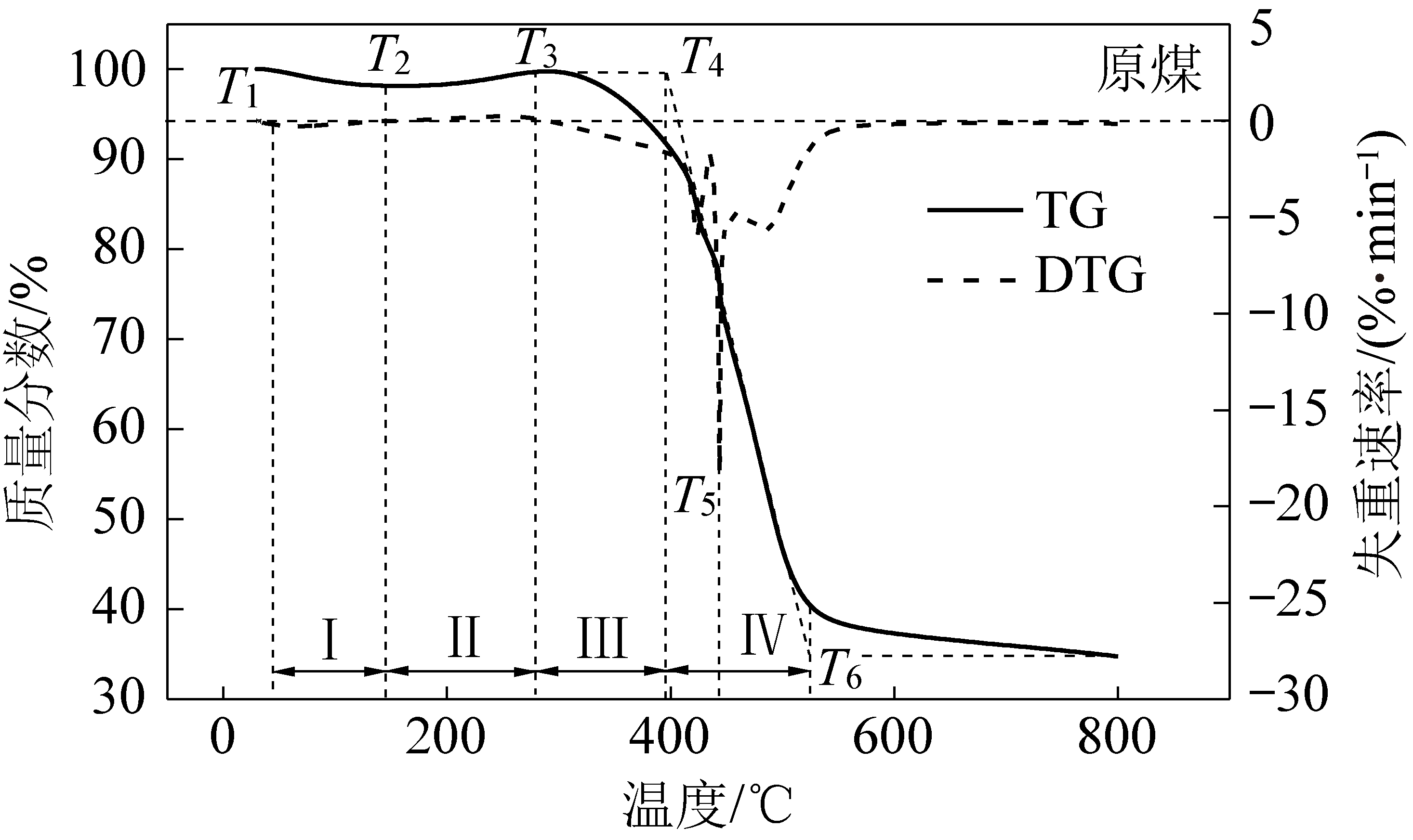特征温度是衡量煤氧复合反应的关键指标,它量化了煤自燃的倾向[14]。以原煤的TG-DTG曲线(图2)为例,热失重过程存在6个特征温度:T1为临界温度,T2为干裂温度,T3为质量极大值温度,T4为燃点温度,T5为最大热失重速率温度,T6为燃尽温度。依据煤的特征温度,将其氧化过程划分为4个阶段,分别为Ⅰ:失水失重阶段(T1~T2),温度升高导致煤中的自由水和结合水蒸发,出现造成质量损失;Ⅱ:吸氧增重阶段(T2~T3),煤氧之间发生物理及化学吸附,样品质量增加;Ⅲ:热解阶段(T3~T4),此阶段煤的氧化反应逐渐加剧;Ⅳ:燃烧阶段(T4~T6),此阶段煤样剧烈燃烧。图2为原煤的TG-DTG曲线。
