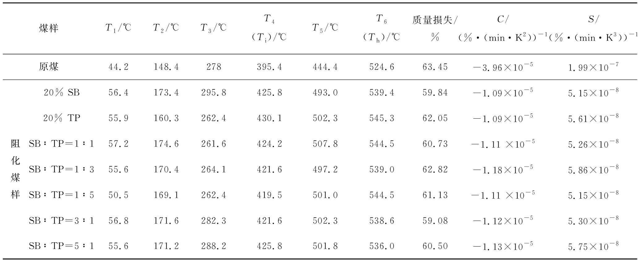 煤样T1/℃T2/℃T3/℃T4(Ti)/℃T5/℃T6(Th)/℃质量损失/%C/(%·(min·K2))-1S/(%·(min·K3))-1原煤44.2148.4278395.4444.4524.663.45-3.96×10-51.99×10-7阻化煤样20% SB56.4173.4295.8425.8493.0539.459.84-1.09×10-55.15×10-820% TP55.9160.3262.4430.1502.3545.362.05-1.09×10-55.61×10-8SB∶TP=1∶157.2174.6261.6424.2507.8544.560.73-1.11 ×10-55.26×10-8SB∶TP=1∶355.6170.4264.1421.6497.2539.062.82-1.18×10-55.86×10-8SB∶TP=1∶550.5169.1262.4419.5501.0544.561.13-1.11 ×10-55.15×10-8SB∶TP=3∶156.8171.6282.3421.6502.3538.659.08-1.12×10-55.30×10-8SB∶TP=5∶155.6171.2288.2425.8501.8536.060.50-1.13×10-55.75×10-8